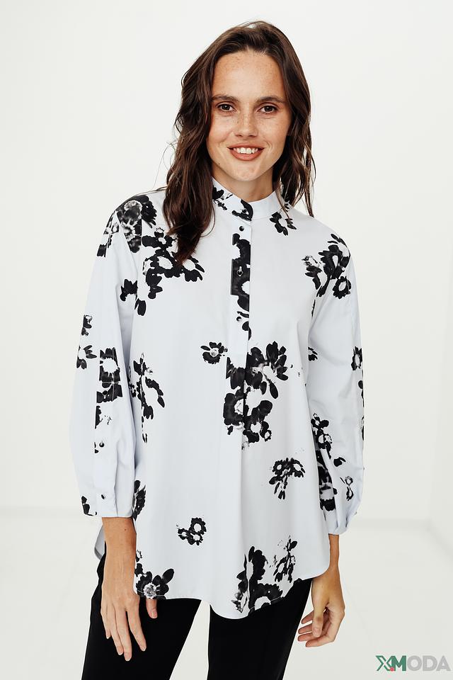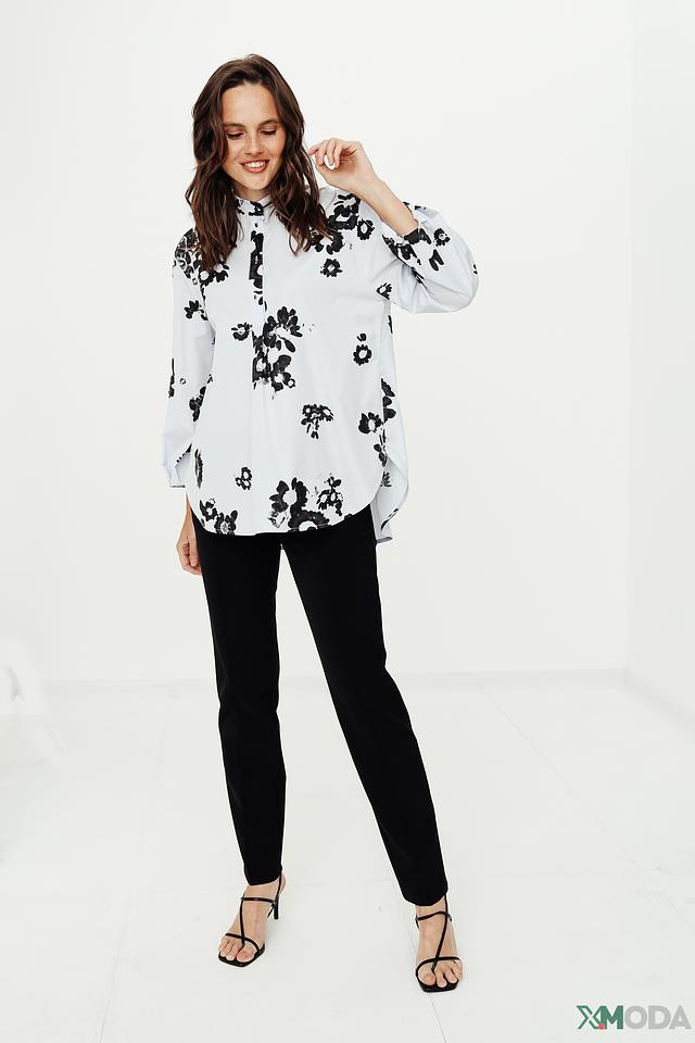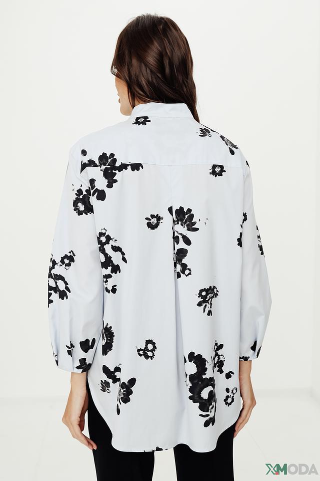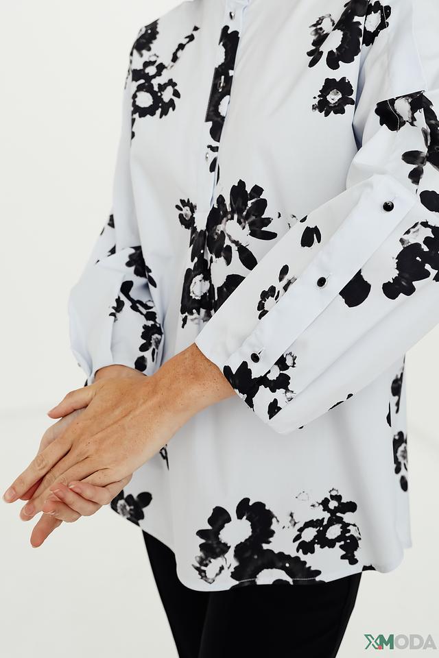 Модель имеет классический рубашечный крой с воротником и застёжкой на пуговицы. Рукава блузы длинные, с манжетами, что позволяет регулировать их длину. Свободный силуэт обеспечивает комфорт и свободу движений.