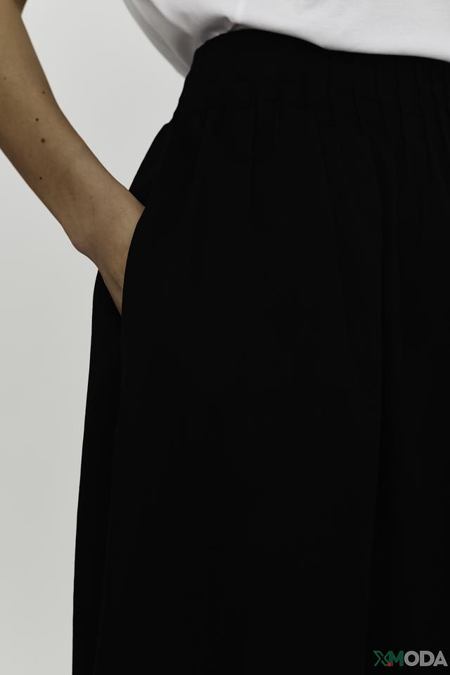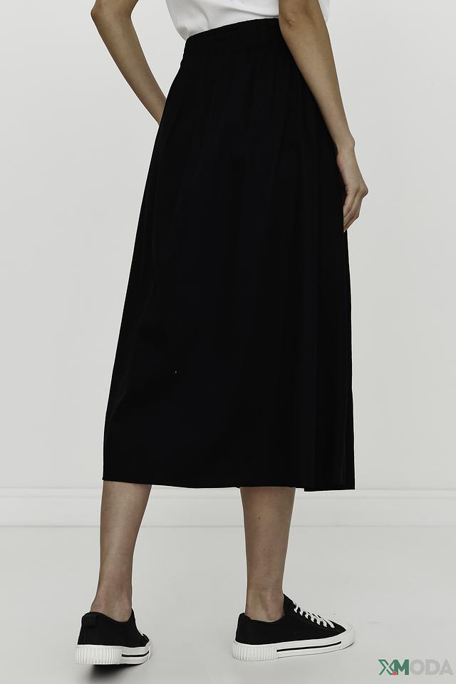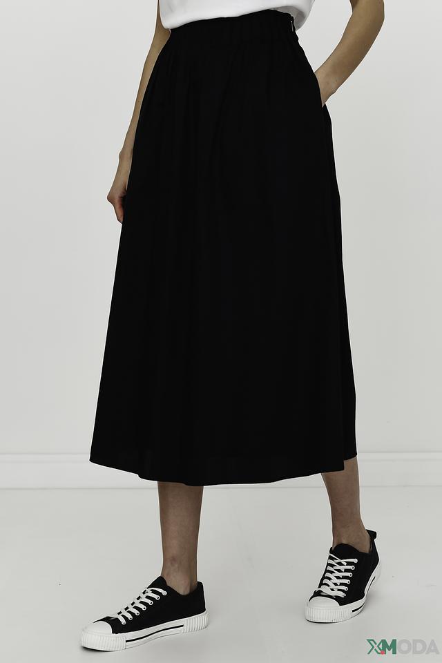 Юбка имеет классический чёрный цвет и длину миди, что делает её универсальной для различных образов. Эластичный пояс на талии обеспечивает удобную посадку и позволяет регулировать облегание.