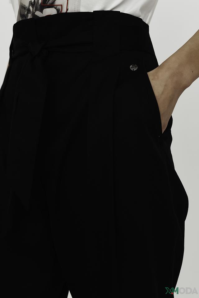 Брюки имеют завышенную талию и свободный крой, обеспечивающий комфорт в носке. Пояс дополнен двумя завязками, которые позволяют регулировать посадку и создавать различные силуэты. На переднем плане брюк расположены аккуратные складки, придающие им более изысканный вид.