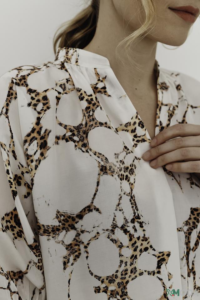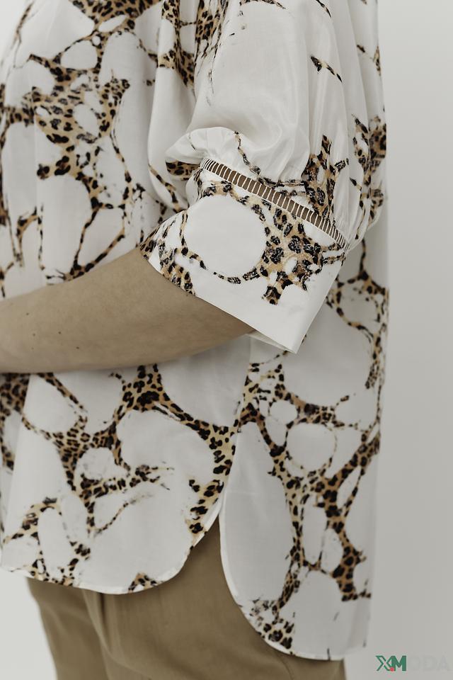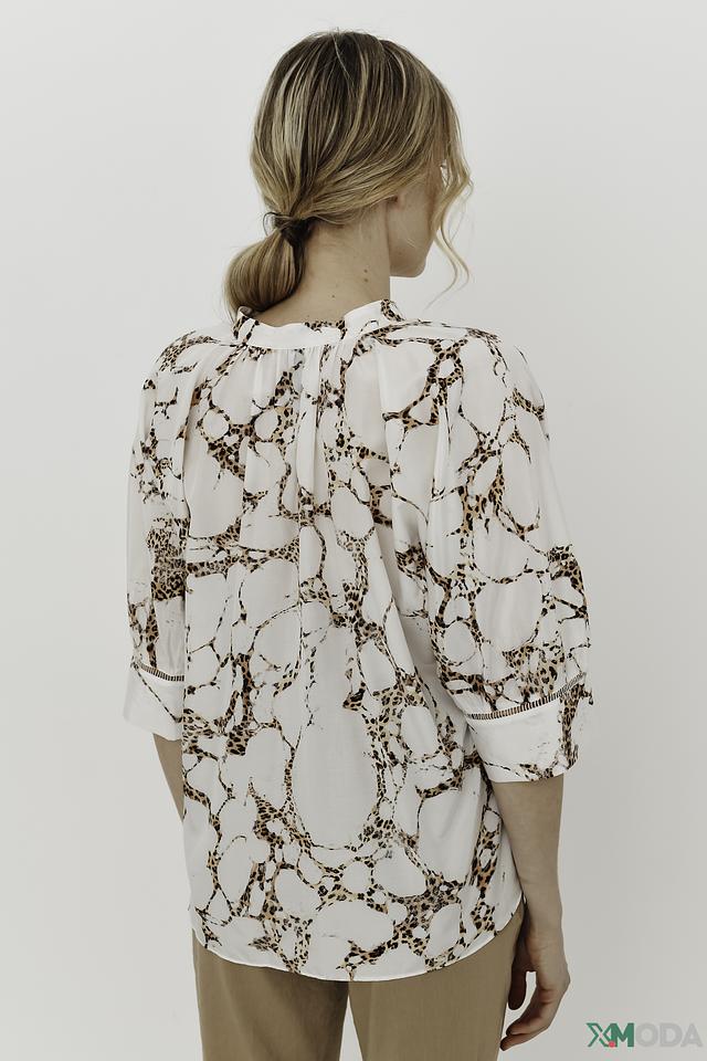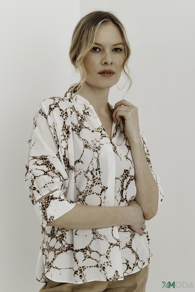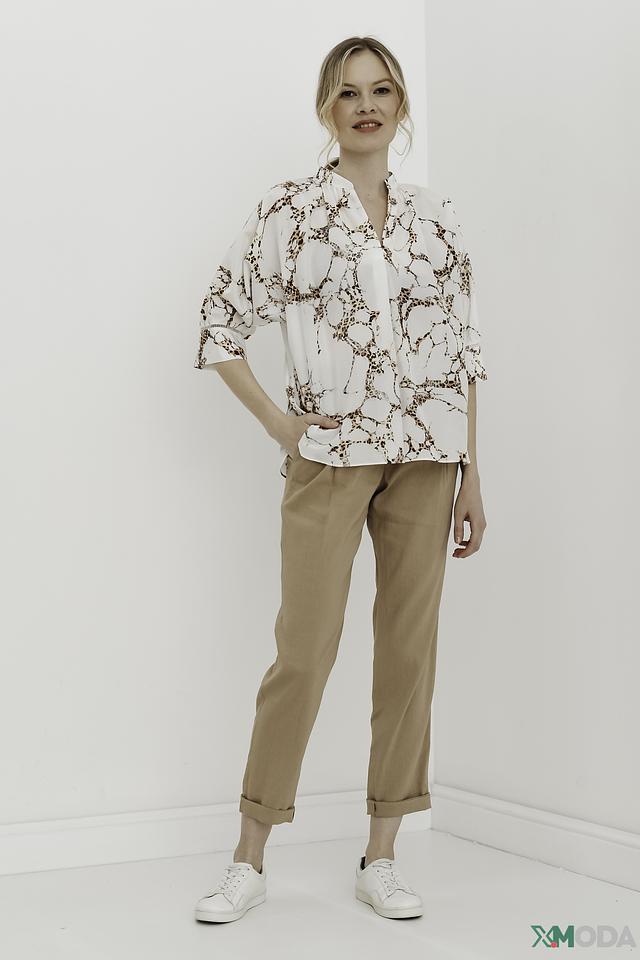 Блуза изготовлена из сочетания шелка (52%) и хлопка (48%), что обеспечивает ей лёгкость, воздухопроницаемость и долговечность. Она идеально сочетается с брюками, юбками и джинсами, позволяя создавать разнообразные стильные комплекты.