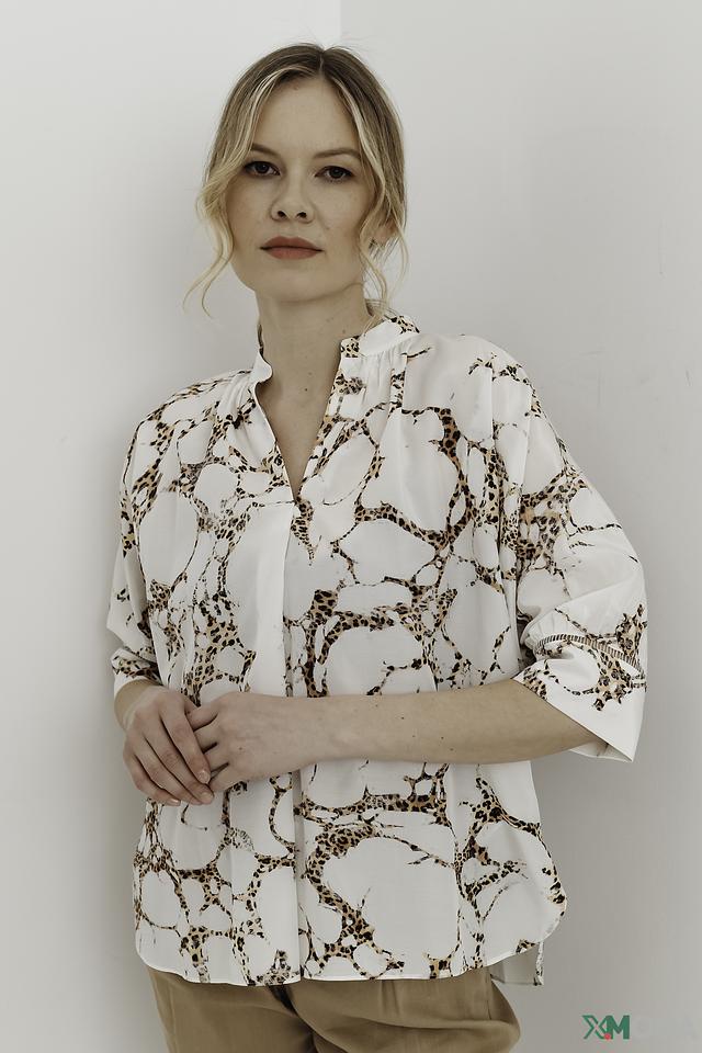 Эта элегантная блуза от Marc Cain станет прекрасным выбором для создания как повседневных, так и более изысканных образов. Блуза выполнена в белом цвете и украшена эффектным принтом, напоминающим переплетённые цепи.
