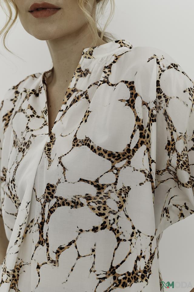 Модель имеет V-образный вырез, который визуально удлиняет шею, и рукава длиной 3/4, что делает её универсальной для любого времени года. Свободный крой обеспечивает комфорт при носке, а качественный материал – приятные тактильные ощущения.
