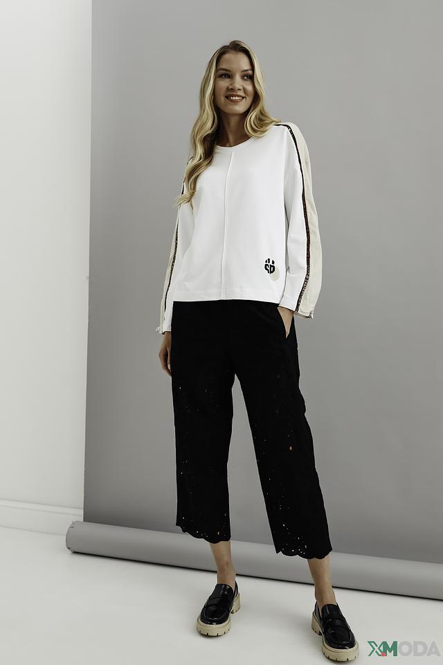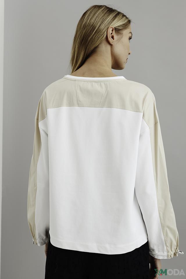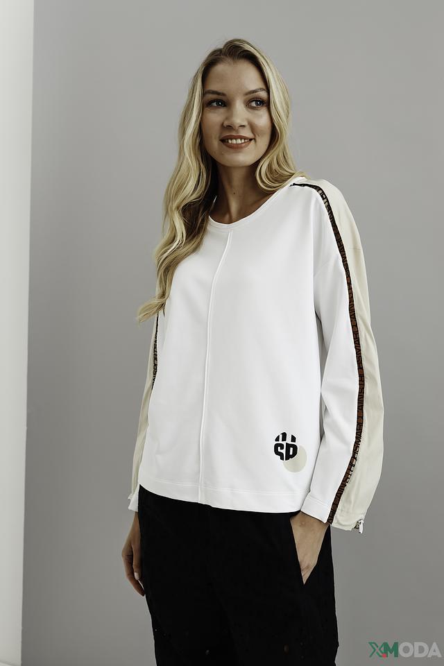 Белый пуловер от Marc Cain с оригинальным логотипом на груди и контрастными полосками на рукавах. Модель свободного кроя, выполнена из мягкого и приятного к телу трикотажа. Состав: полиамид 64%, хлопок 33%, эластан 3%