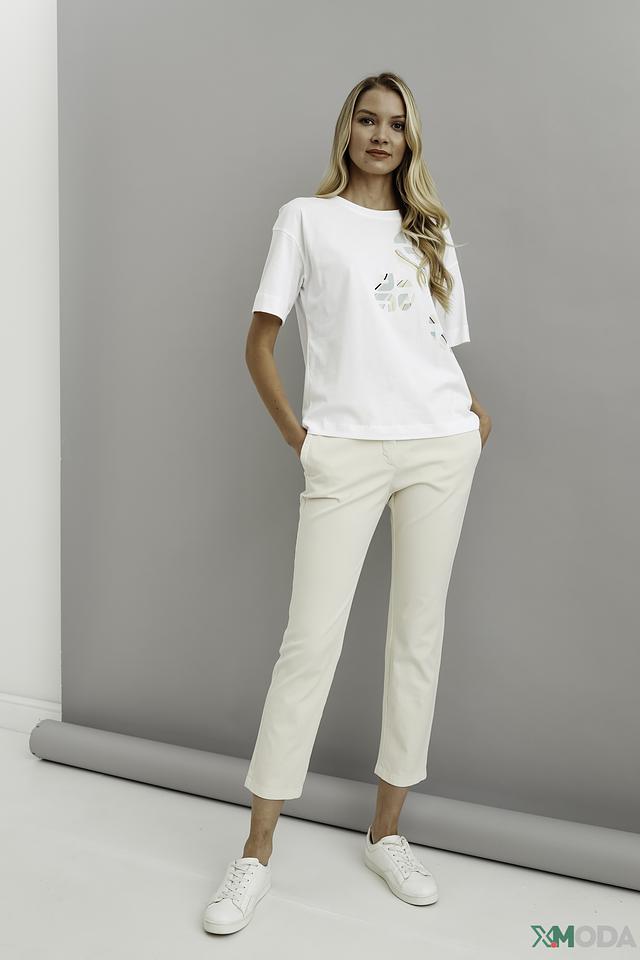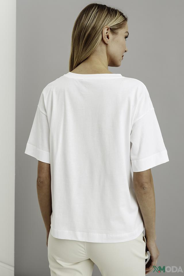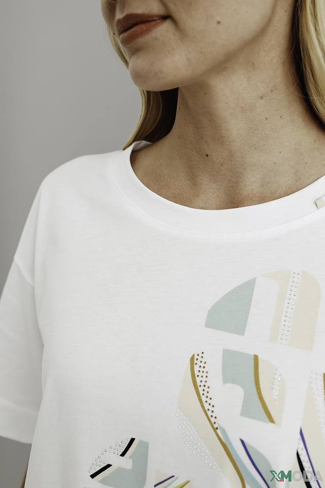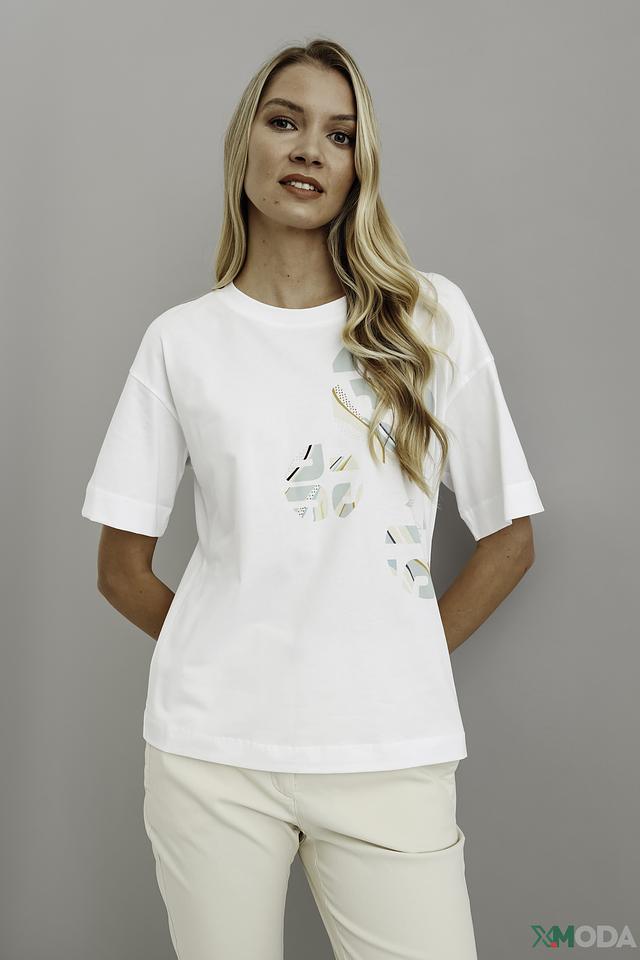 Белая футболка Marc Cain с оригинальным принтом — стильное и комфортное решение для повседневного образа. Изготовлена из 100% хлопка, обеспечивающего приятные ощущения на коже. Состав: хлопок 100%