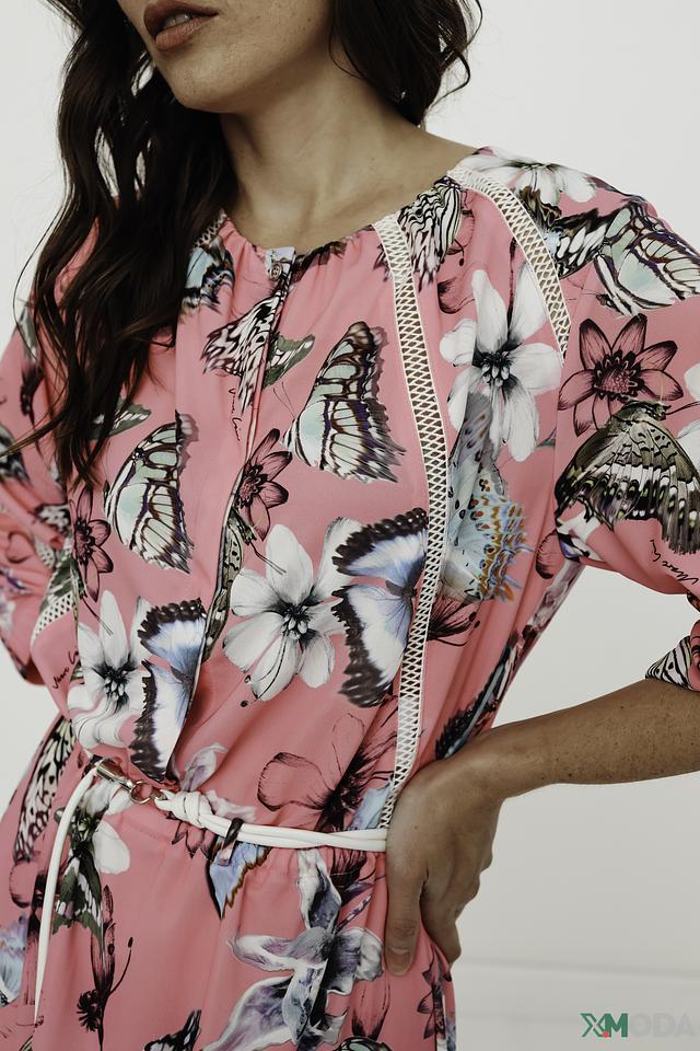 Это стильное платье от Marc Cain выполнено из легкого и приятного к телу полиэстера. Преобладающий цвет – нежно-розовый, который служит идеальным фоном для яркого и красочного принта с изображением бабочек и цветов.