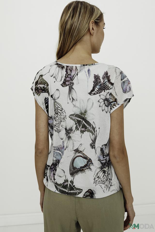 Женский пуловер Marc Cain белого цвета с ярким принтом бабочек и цветов. Модель с короткими рукавами и округлым вырезом горловины станет стильным дополнением к вашему гардеробу. Состав: хлопок 82%, полиамид 18%