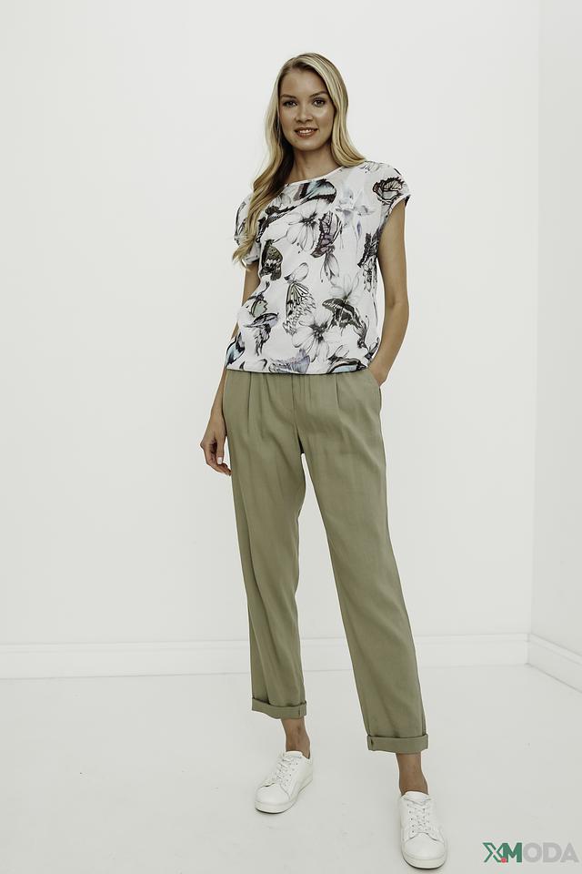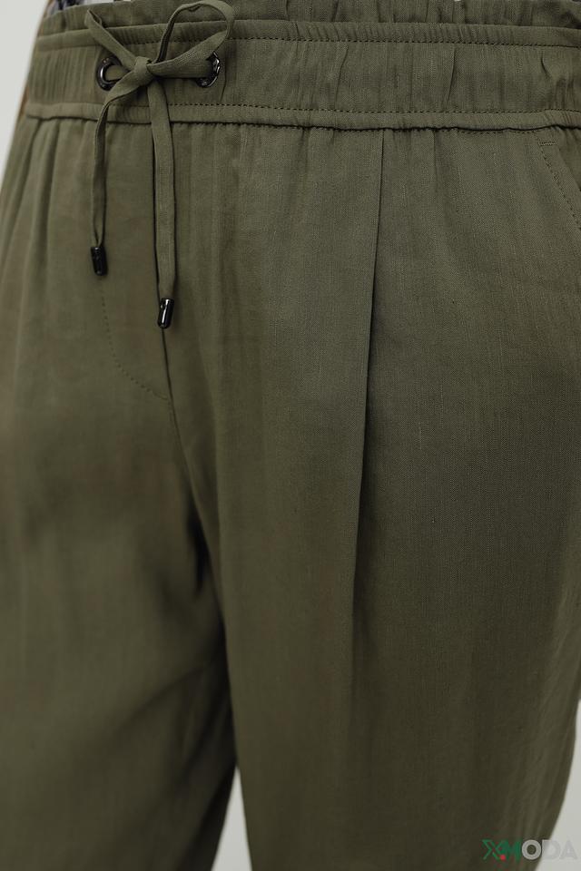Брюки имеют прямой крой, пояс на резинке с кулиской для регулировки посадки и зауженные книзу брючины. Ткань, состоящая из льна, вискозы и эластана, обеспечивает комфорт в носке и приятные тактильные ощущения.