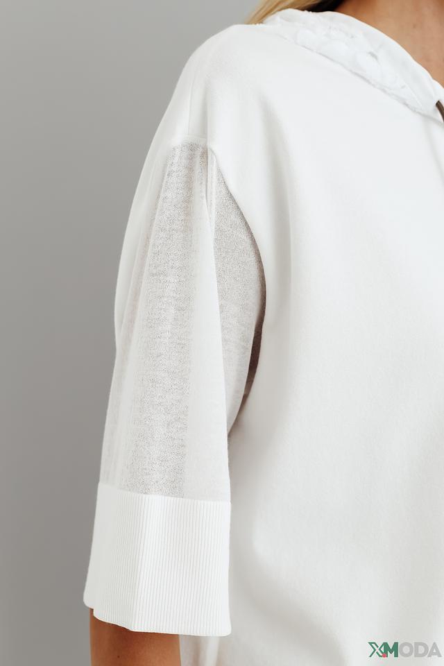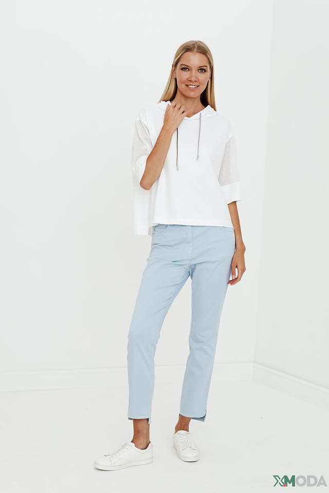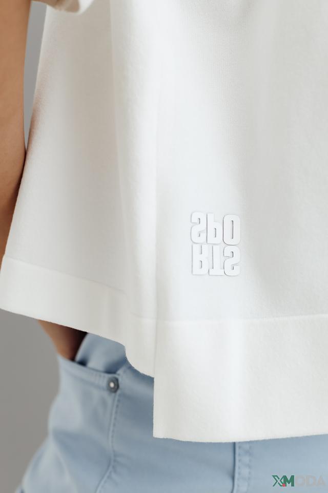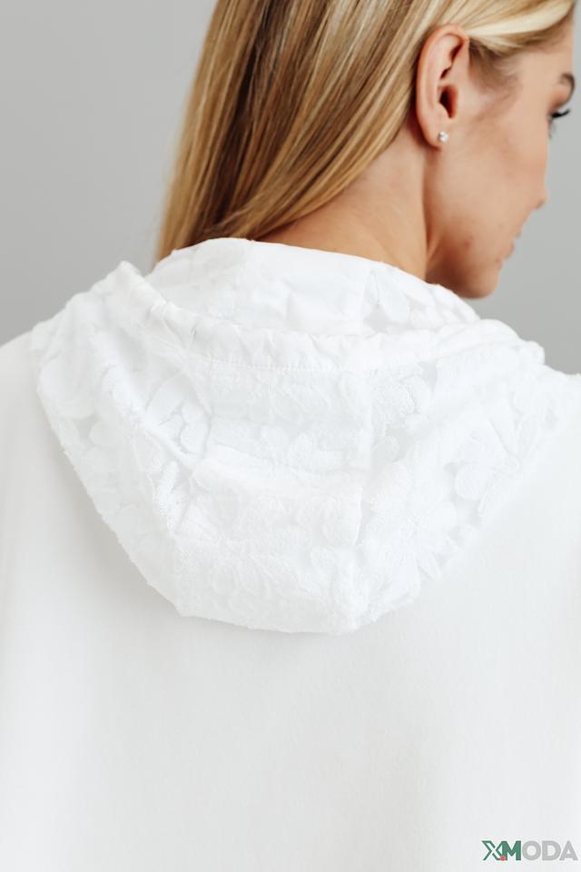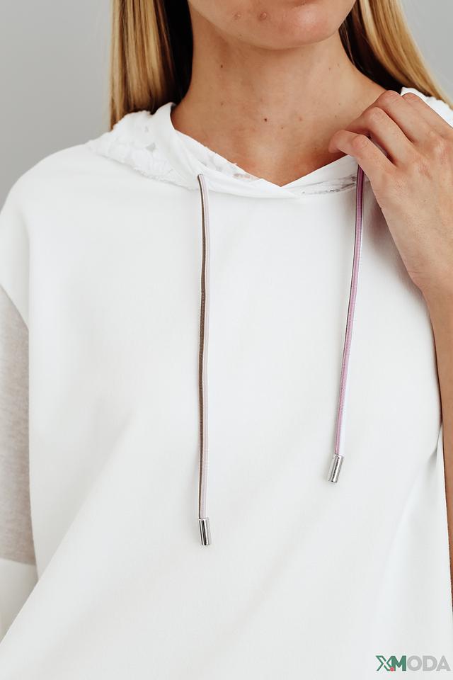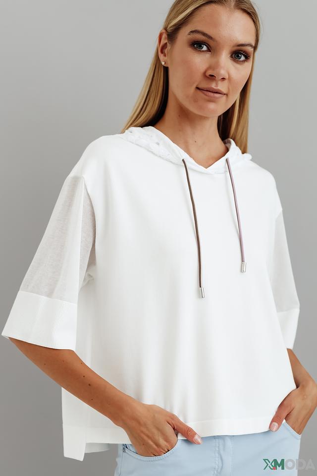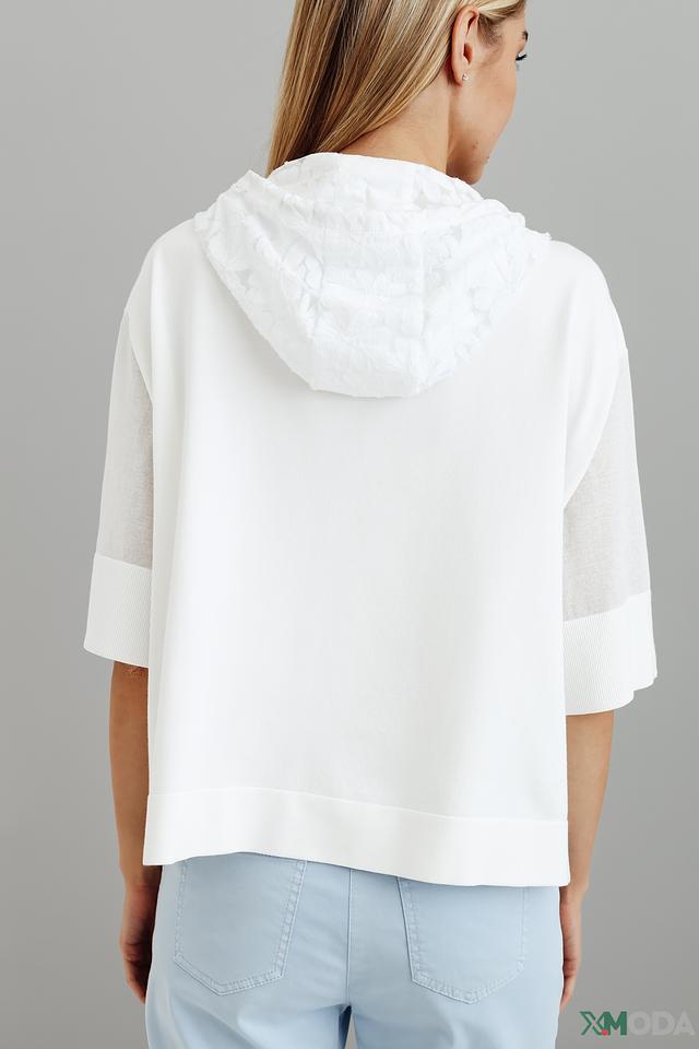 Белый пуловер от Marc Cain с капюшоном и короткими рукавами. Модель выполнена из мягкой вискозы с добавлением полиэстера и хлопка, что обеспечивает комфорт и удобство в носке. Состав: вискоза 65%, полиэстер 28%, хлопок 7%