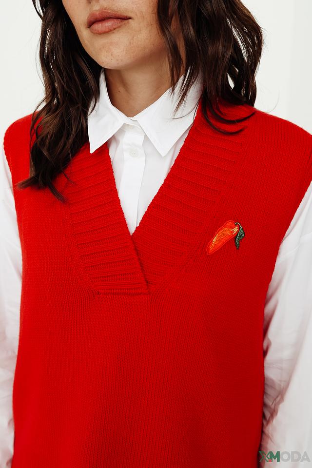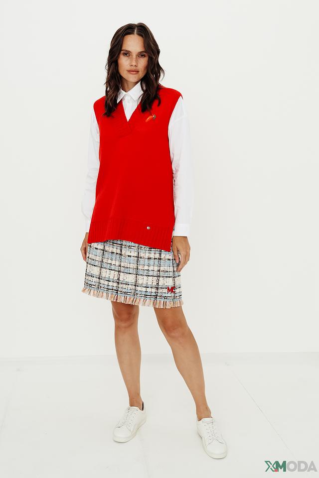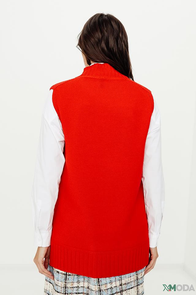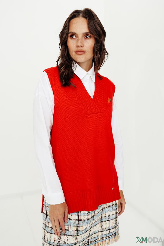 Красный вязаный жилет Marc Cain – стильная и комфортная модель из 100% шерсти. V-образный вырез и декоративная брошь добавляют изысканности образу. Идеально сочетается с рубашками и юбками. Состав: шерсть 100%
