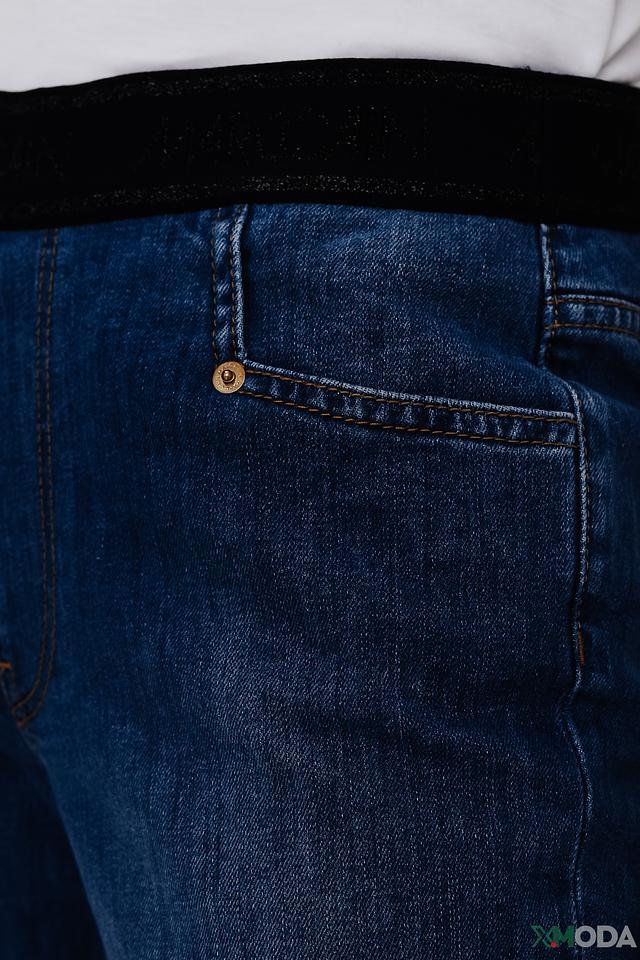 Модель имеет классический синий цвет и зауженный к низу крой, который визуально удлиняет ноги и создает элегантный силуэт. Удобный эластичный пояс обеспечивает комфортную посадку по фигуре, не стесняя движений.