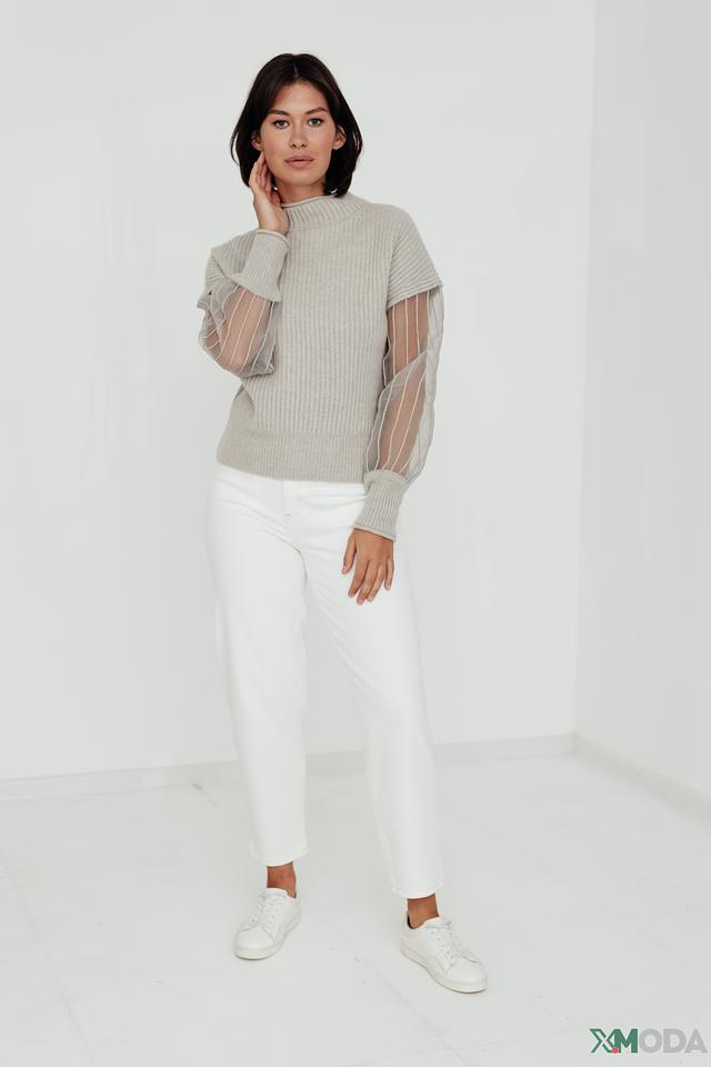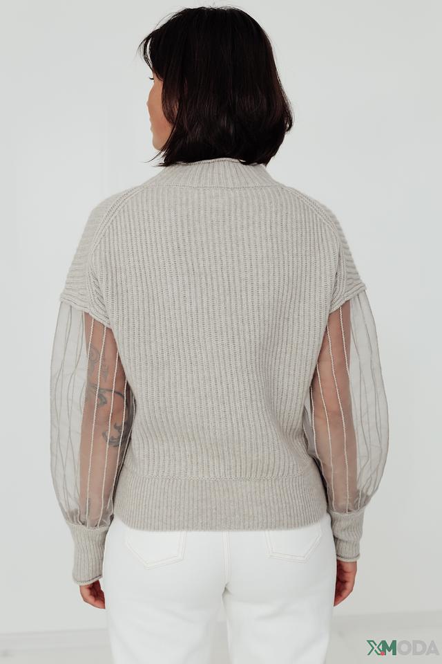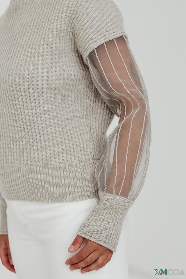 Особенностью модели являются рукава, выполненные из полупрозрачной сетки, что придает образу легкость и изысканность. Текстура вязания подчеркивает качество изделия.