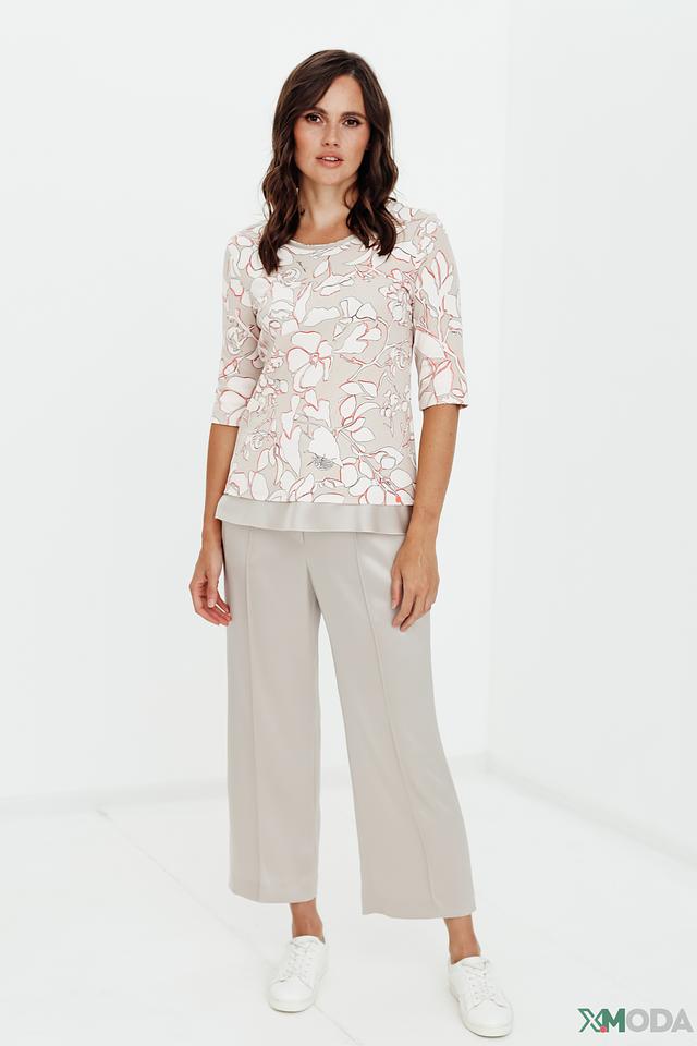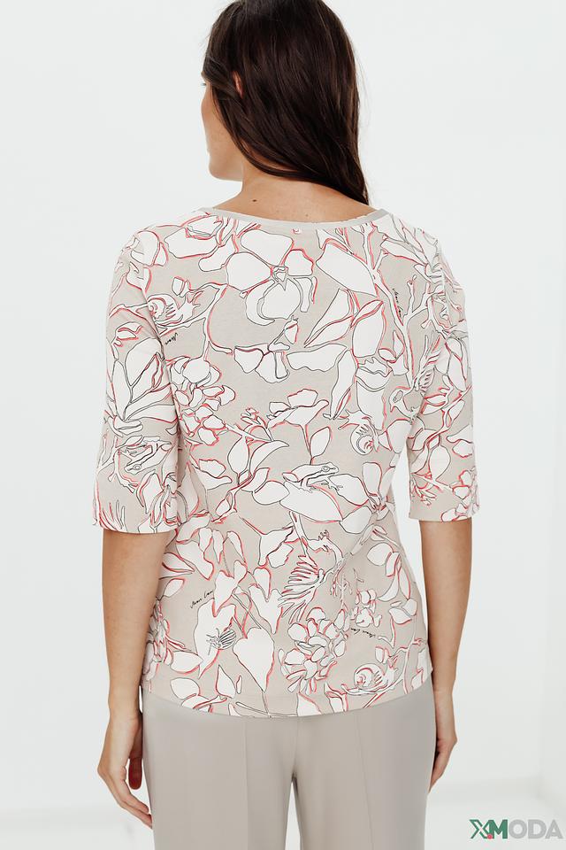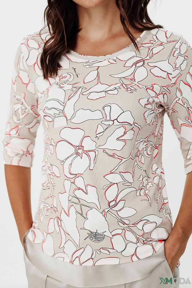 Женская футболка Marc Cain бежевого цвета с ярким цветочным принтом. Модель выполнена из мягкого хлопка с добавлением эластана для комфорта и отличной посадки. Идеальный выбор для создания стильного повседневного образа. Состав: хлопок 94%, эластан 6%