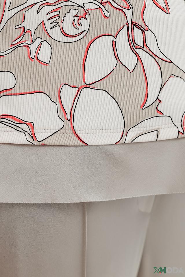 Особенностью модели является оригинальный цветочный принт, выполненный в нежных оттенках красного и бежевого. Футболка имеет прямой крой и короткие рукава, что делает ее универсальной для различных типов фигур.