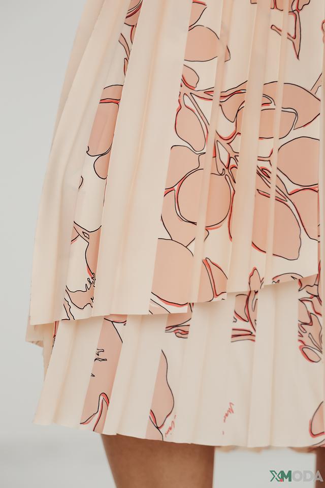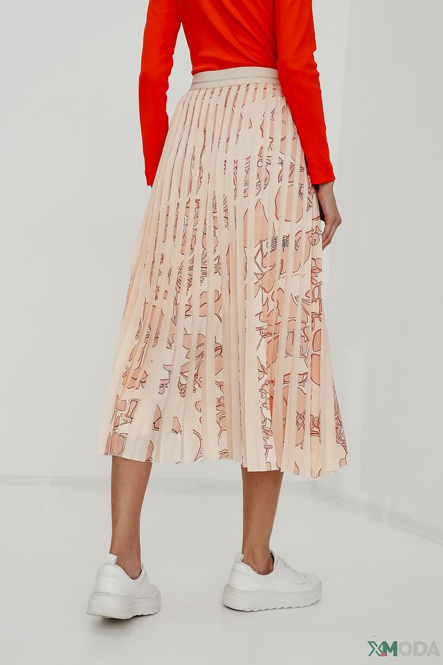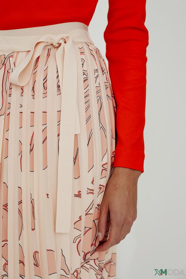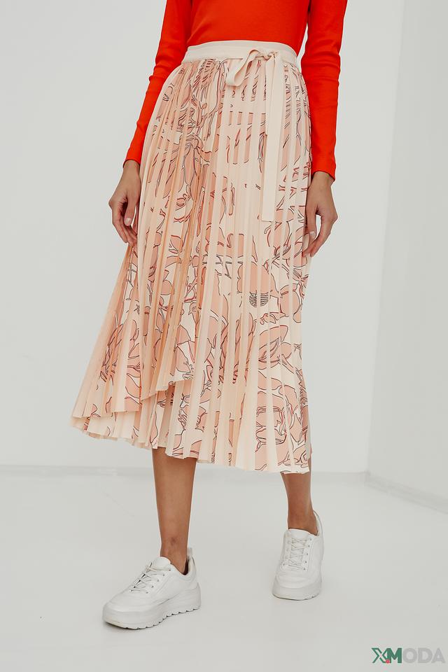 Юбка имеет приятный персиковый оттенок и украшена нежным цветочным принтом, который придает ей женственности и романтичности. Плиссированная текстура создает эффект движения и объема.