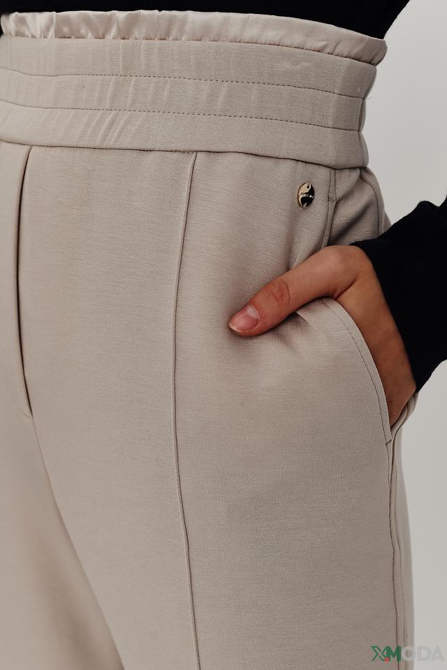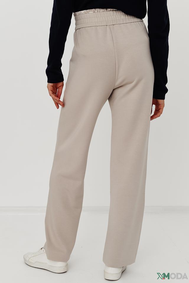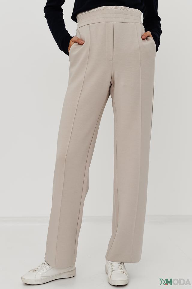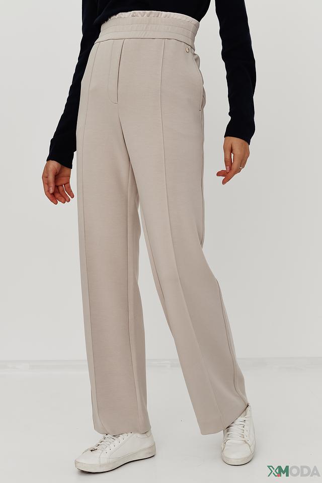 Брюки имеют прямой крой и завышенную талию, что визуально удлиняет ноги и подчеркивает фигуру. Эластичный пояс обеспечивает комфортную посадку и свободу движений.