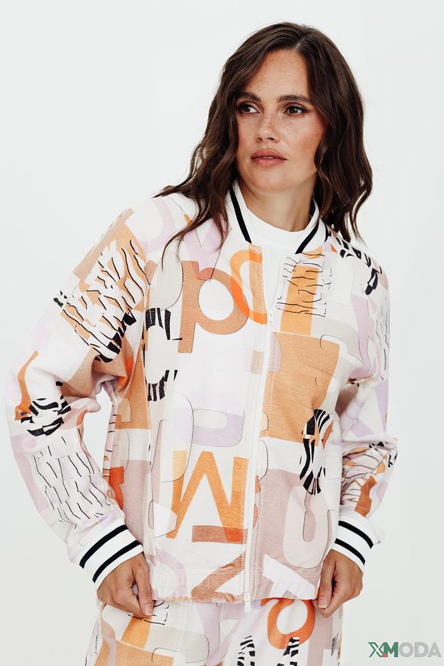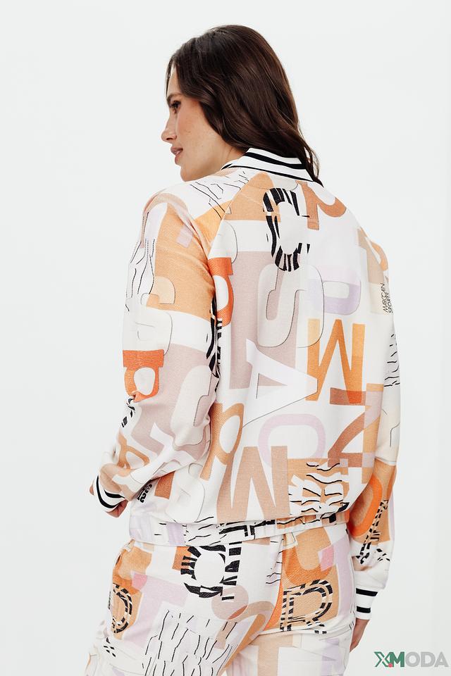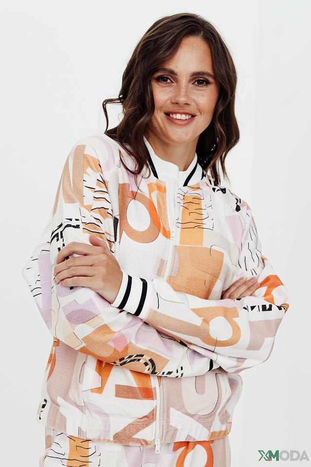 Жакет имеет свободный крой и застегивается на молнию. Дизайн украшен оригинальным принтом, сочетающим в себе различные элементы и оттенки.