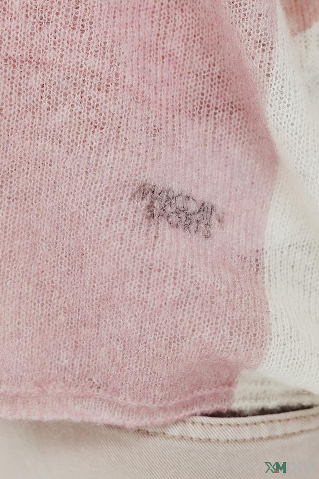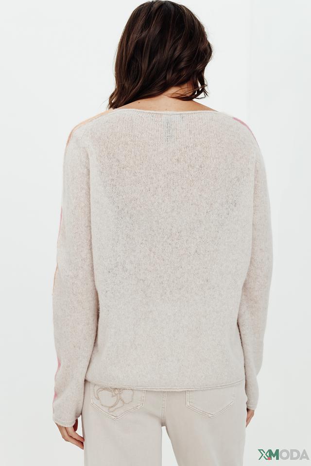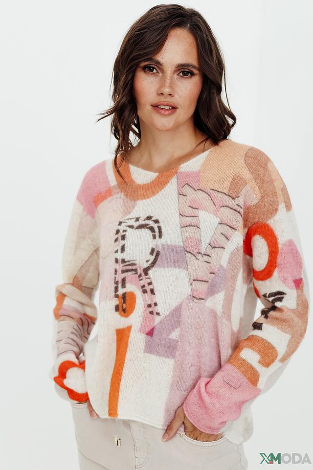 Пуловер имеет свободный крой и округлый вырез горловины. Его отличает яркий и оригинальный абстрактный принт, выполненный в нежных пастельных тонах: розовом, оранжевом, лавандовом и бежевом. Такой рисунок делает этот пуловер уникальным и привлекающим внимание.