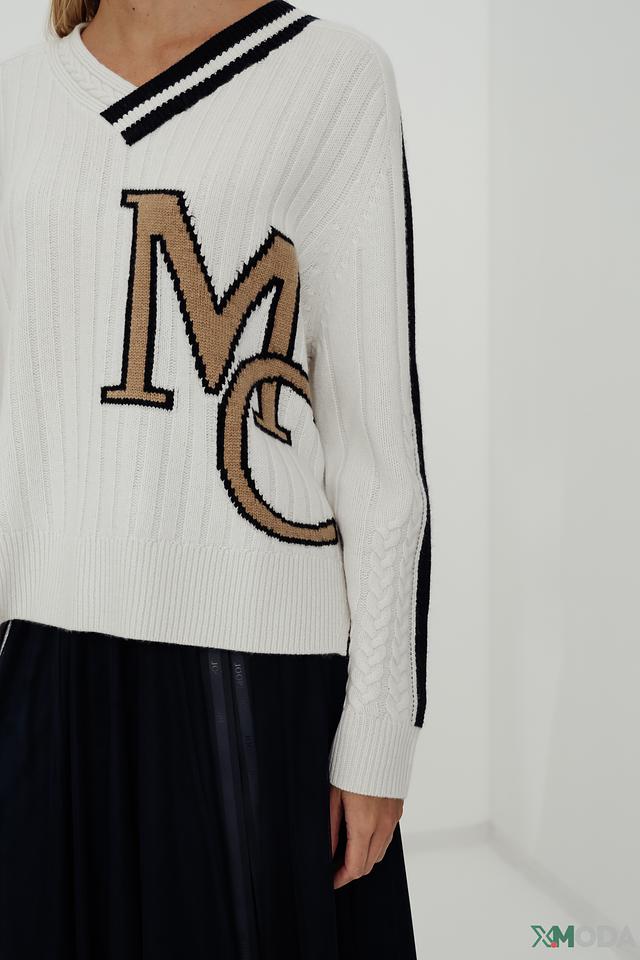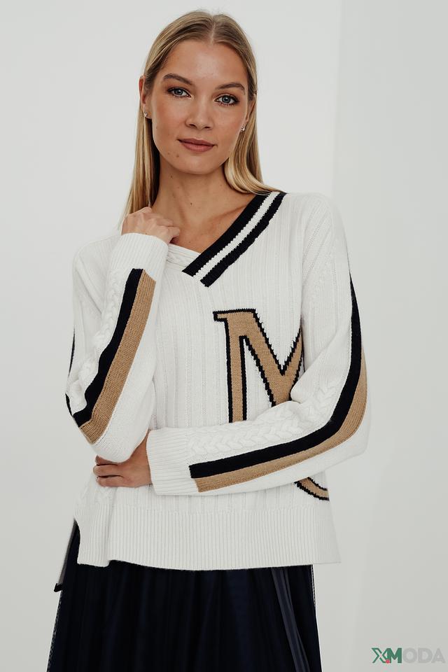 Передняя часть пуловера украшена декоративной буквой "M", выполненной в золотистом и чёрном цвете, что придает изделию особый шарм и узнаваемость. Рукава и горловина отделаны полосками в чёрно-золотистой гамме, добавляя контраст и динамику.