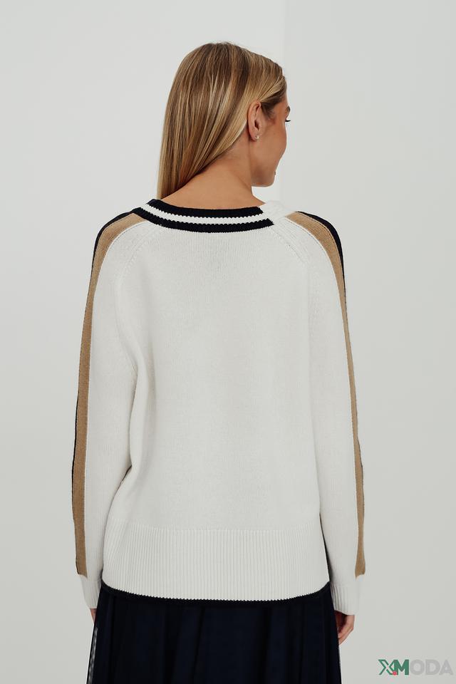 Белый пуловер Marc Cain с V-образным вырезом и декоративной буквой "M" на передней части. Изготовлен из высококачественной шерсти и кашемира для максимального комфорта и тепла. Состав: шерсть 90%, кашемир 10%