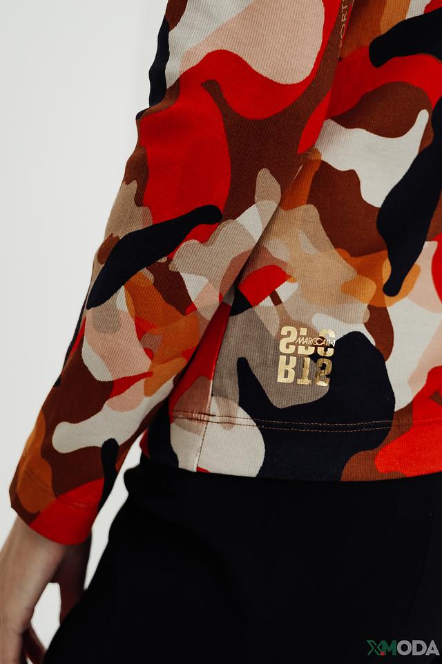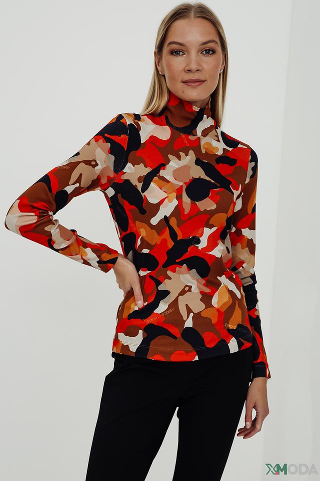 Женская водолазка Marc Cain яркого оранжево-коричневого цвета с оригинальным абстрактным принтом. Изготовлена из мягкого хлопка с добавлением эластана для комфортной посадки и свободы движений. Состав: хлопок 94%, эластан 6%