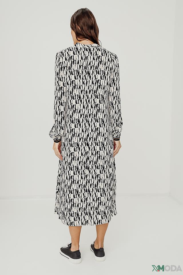 Платье Marc Cain чёрно-белого цвета с оригинальным абстрактным принтом. Модель выполнена из лёгкой ткани на основе вискозы и шёлка, имеет V-образный вырез и длинные рукава. Состав: вискоза 66%, шелк 34%