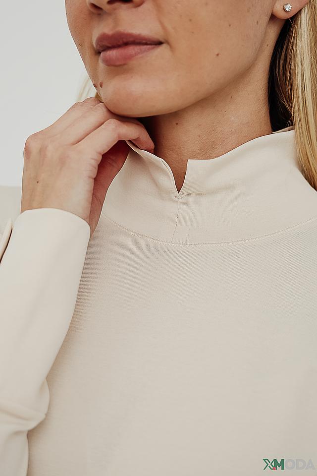 Бежевая блуза Marc Cain с длинными рукавами и аккуратным воротником-стойкой. Модель выполнена из мягкого трикотажа с добавлением эластана для комфортной посадки и украшена декоративными пуговицами на манжетах. Состав: хлопок 95%, эластан 5%