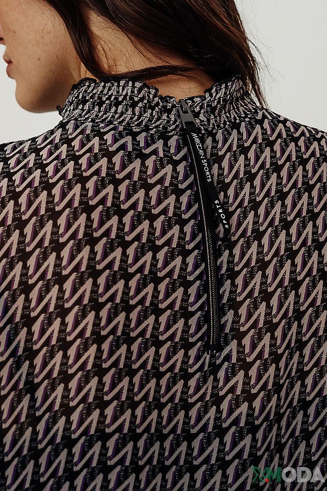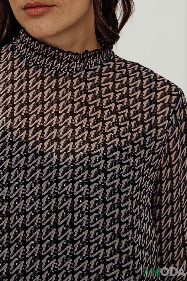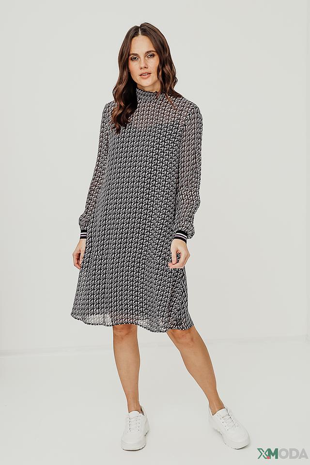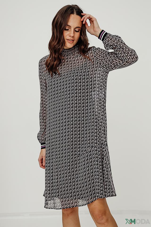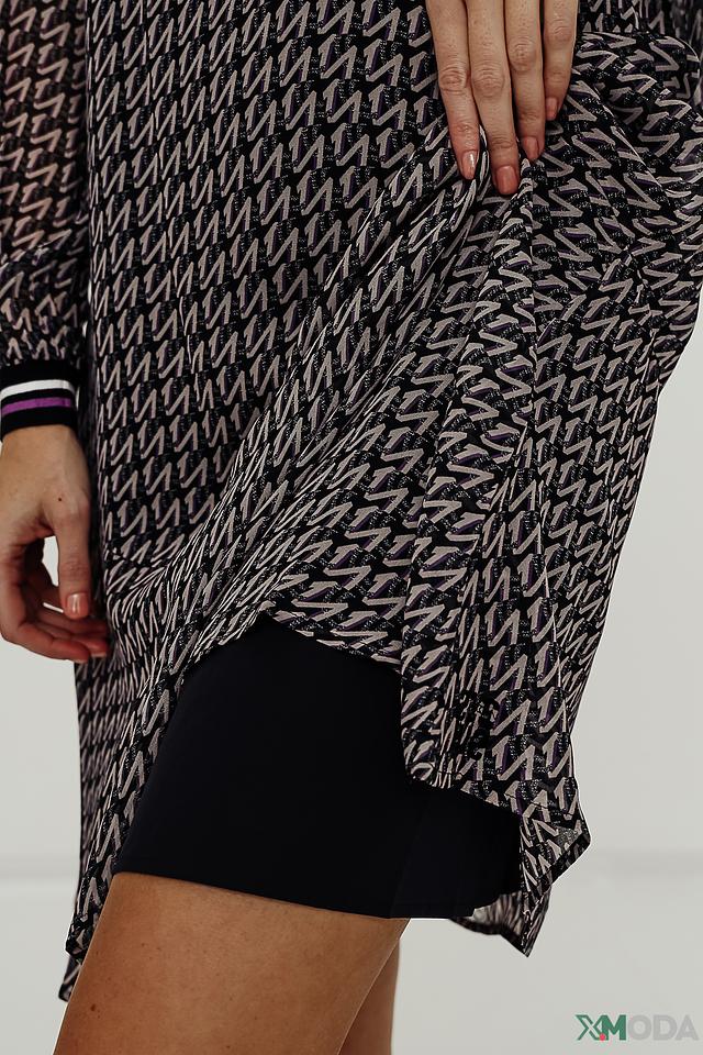 Основной цвет платья – чёрный, но его визуально оживляет яркий геометрический принт, выполненный в фиолетовых и белых тонах. Платье имеет прямой силуэт, длину чуть выше колена и длинные рукава с манжетами, отделанными контрастной полосой.