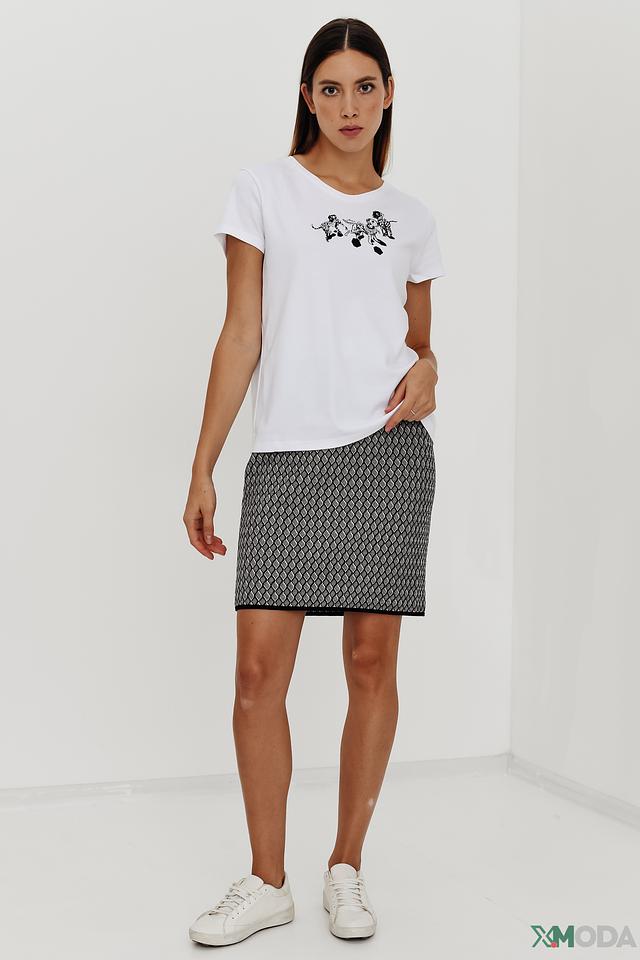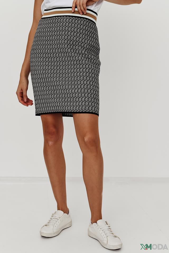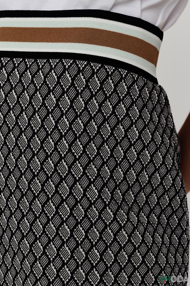 Основной цвет юбки – чёрный, украшен выразительным геометрическим принтом в белых и серых тонах. Эластичный пояс обеспечивает комфортную посадку по фигуре, а высококачественный трикотаж – приятные тактильные ощущения.