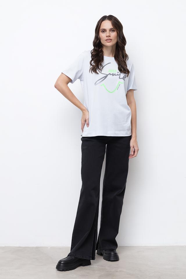 Модель имеет свободный крой, что обеспечивает максимальный комфорт при ношении. На передней части футболки расположен яркий принт "Just Smile", выполненный в сочетании серебристого и лаймового цветов, добавляющий образу оригинальности.