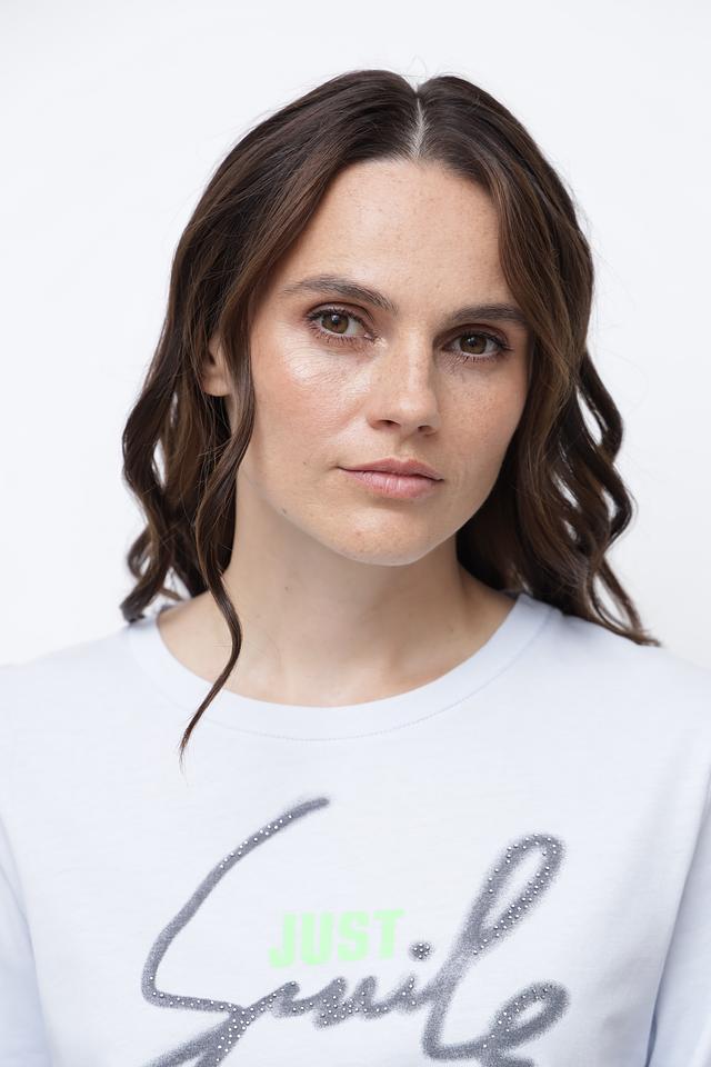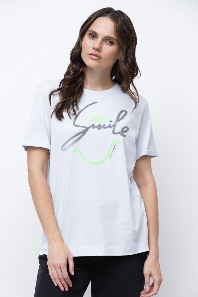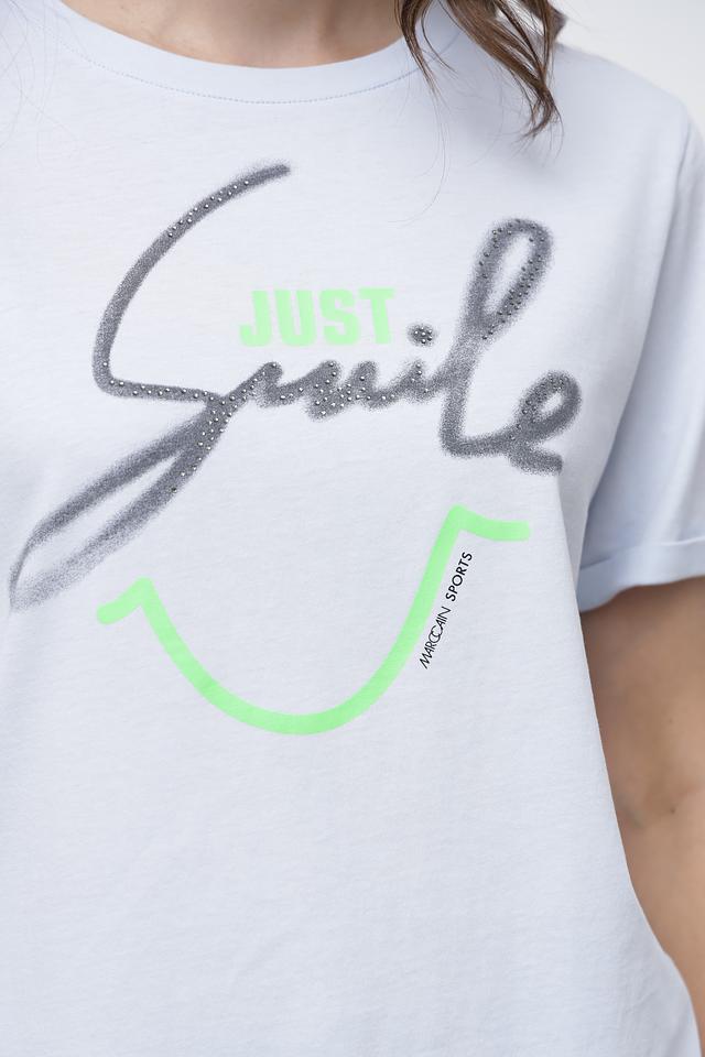Белая футболка Marc Cain Sports с оригинальным принтом "Just Smile". Модель свободного кроя из 100% хлопка обеспечит комфорт в повседневной носке. Стильный и лаконичный дизайн. Состав: хлопок 100%