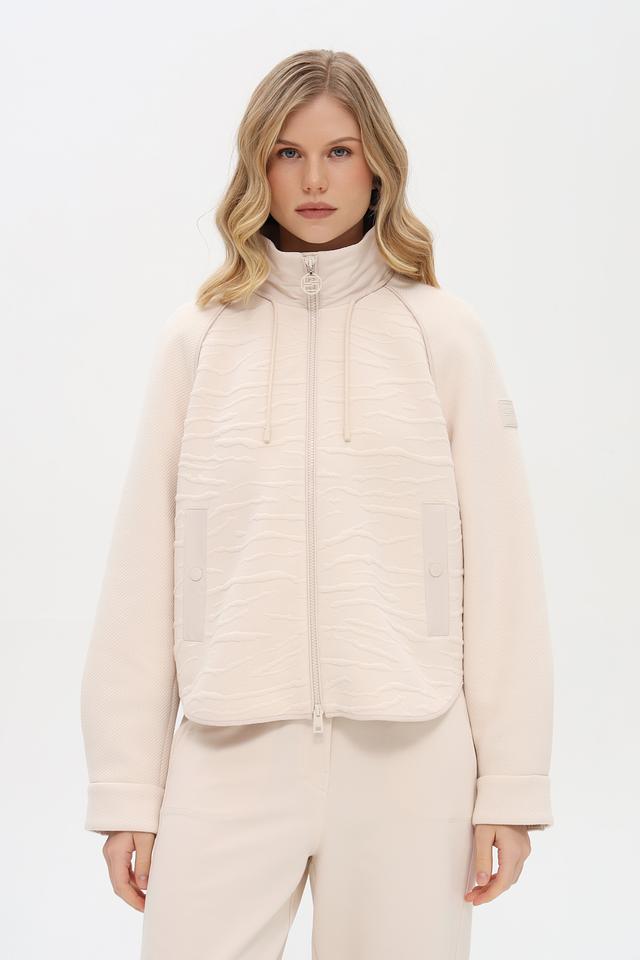 Жакет имеет оригинальную стеганую фактуру, которая придает ему особый шарм. Высокий воротник-стойка с капюшоном и застежка-молния обеспечивают дополнительный комфорт и защиту от непогоды. Боковые карманы на молнии позволяют безопасно хранить необходимые мелочи.