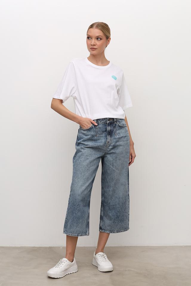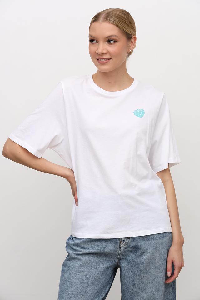 Модель имеет прямой крой, который подходит для любой фигуры. Короткие рукава делают футболку идеальной для теплой погоды. На груди расположена вышивка в виде клубники, добавляющая образу игривости и оригинальности.