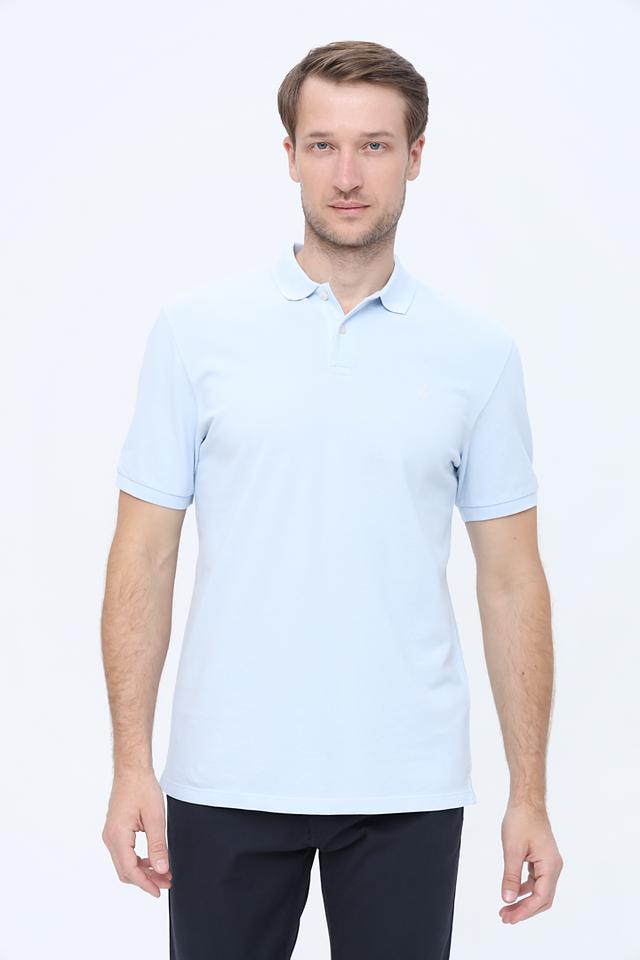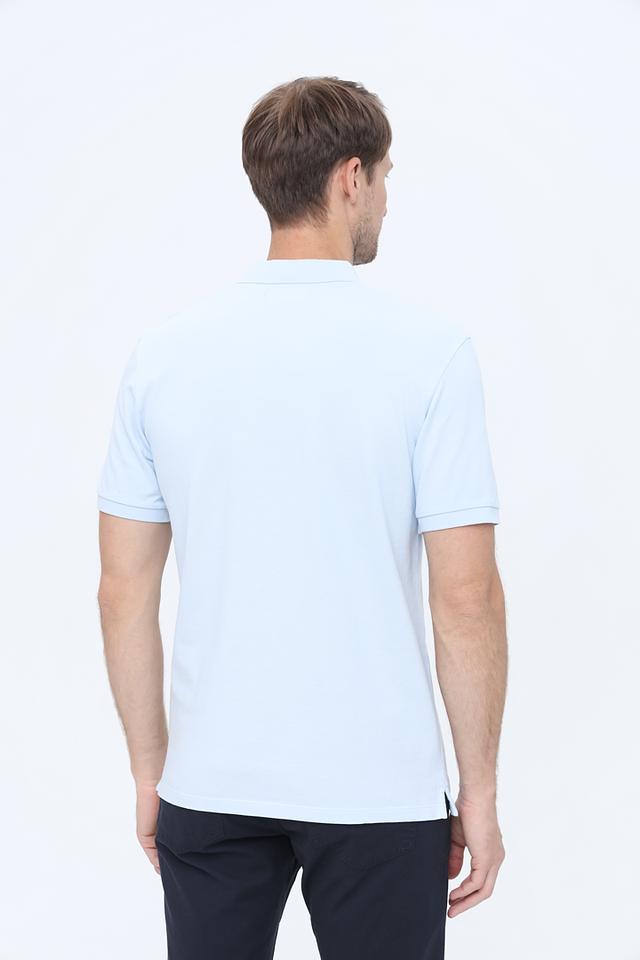 Поло имеет короткие рукава и традиционный воротник-поло с застёжкой на пуговицы. Цвет поло – нежный голубой, что делает его отличным выбором для тёплой погоды. Минималистичный дизайн подчеркивает качество материалов и безупречный крой.