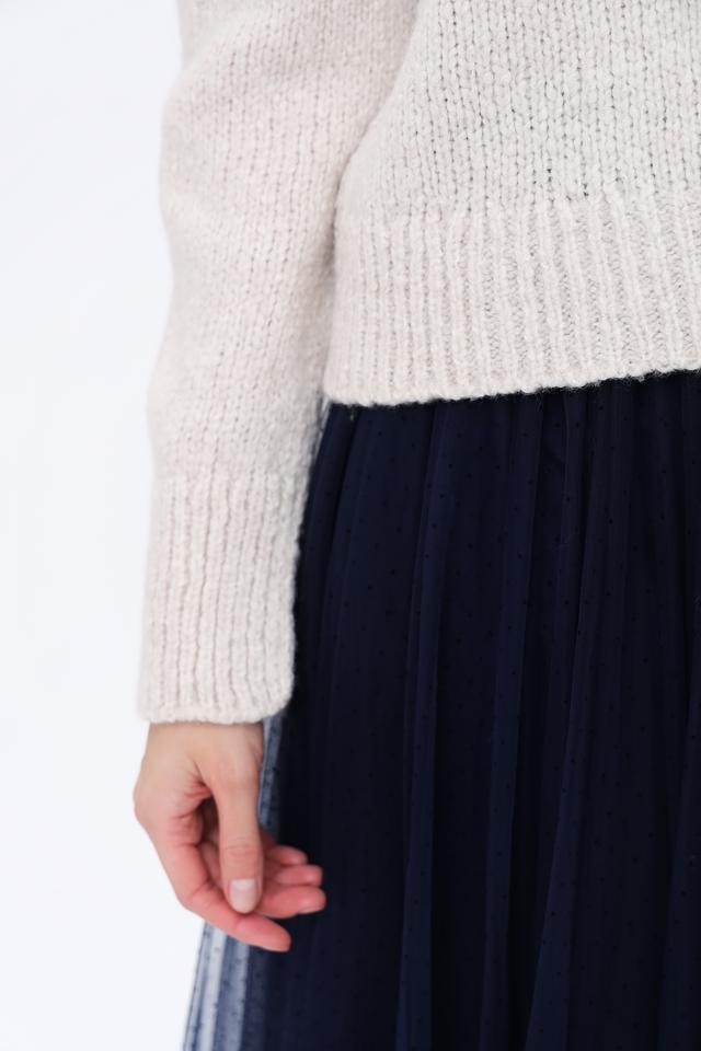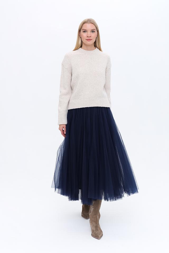 Модель имеет свободный крой, который обеспечивает свободу движений и комфорт в носке. Округлый вырез горловины придает пуловеру классический вид. Текстурная вязка добавляет изделию объем и визуальный интерес.