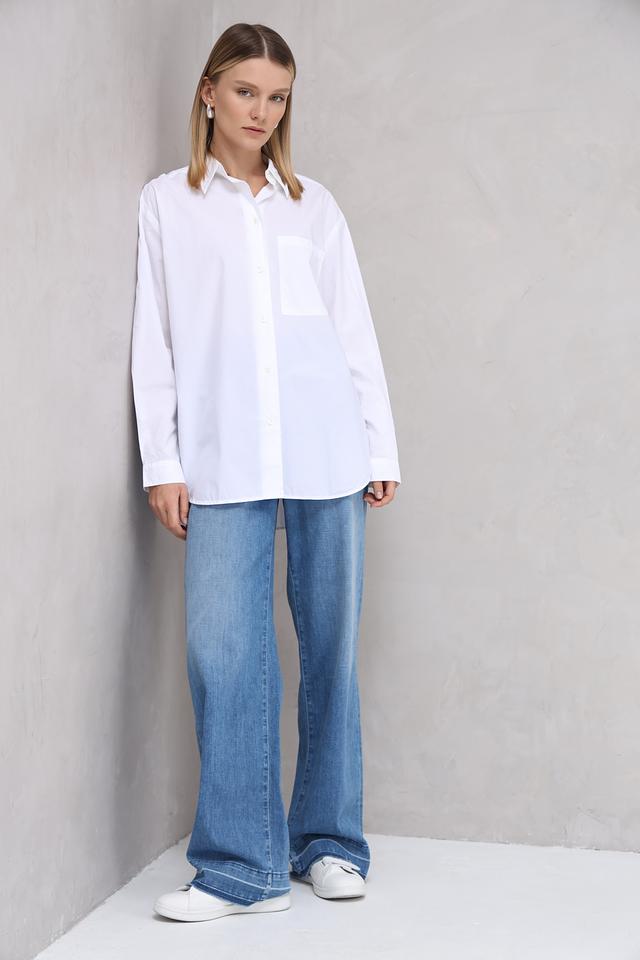 Рубашка имеет свободный, оверсайз крой, который обеспечивает комфорт и свободу движений. Воротник рубашки классической формы, застёжка выполнена на пуговицы. На груди расположен накладной карман, добавляющий функциональности и стиля.