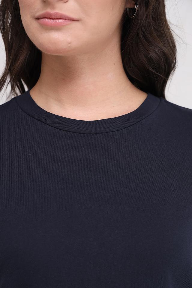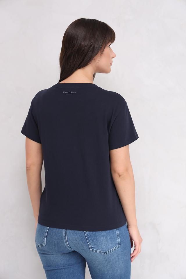 Футболка имеет однотонный тёмно-синий цвет, который легко сочетается с другими элементами гардероба. На задней части футболки расположен небольшой логотип бренда Marc O Polo.