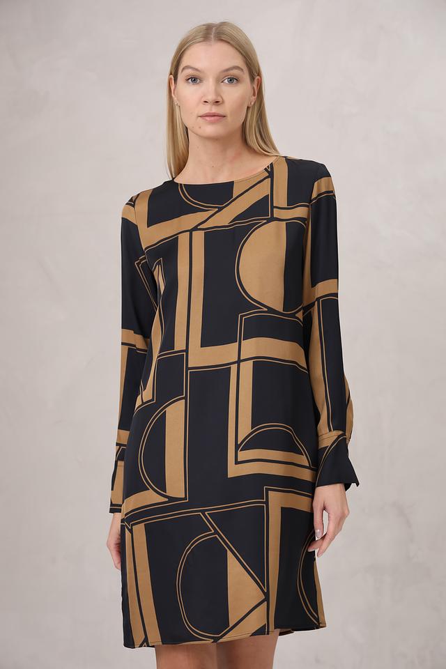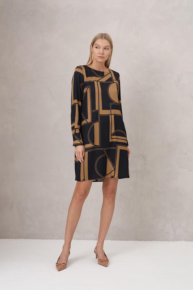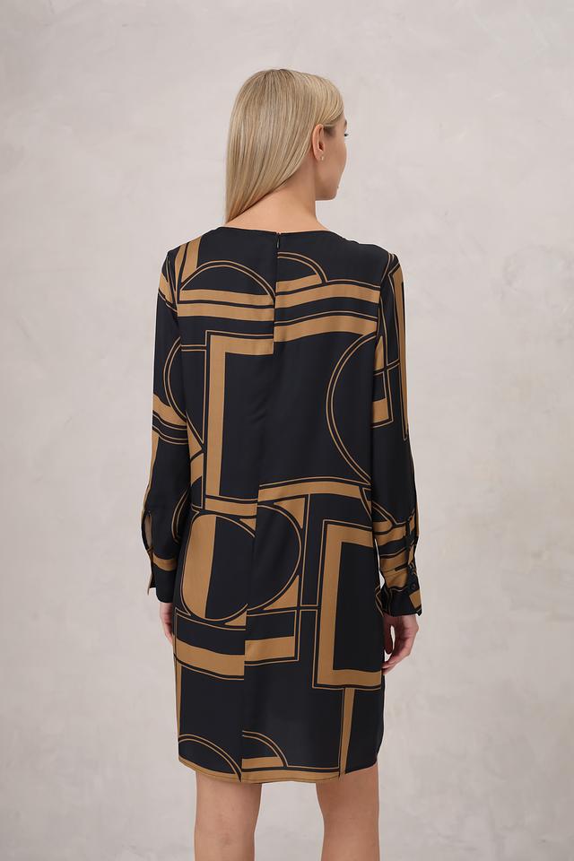 Дизайн платья представлен в виде геометрического принта, сочетающего в себе черные и золотистые оттенки. Прямой крой платья подчеркивает фигуру, а длинные рукава делают его подходящим для прохладной погоды.