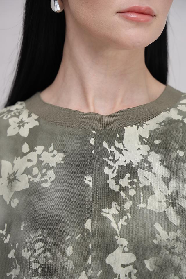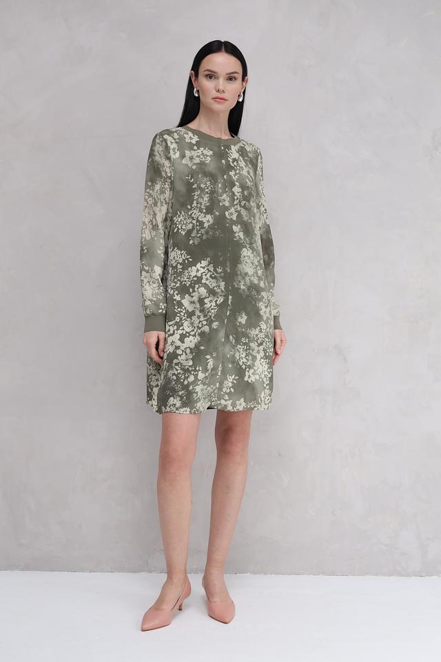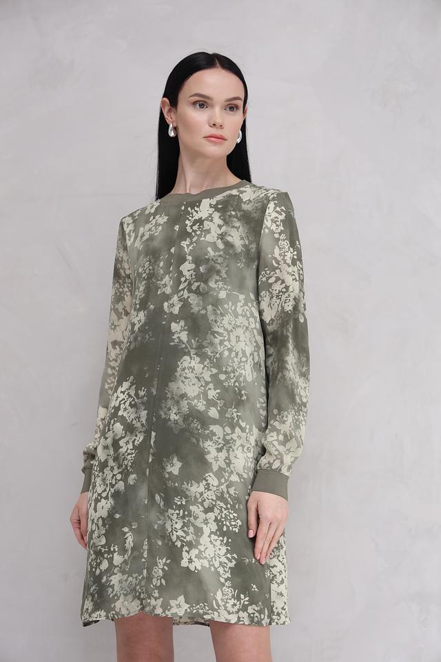 Платье имеет прямой силуэт, длину чуть выше колена и длинные рукава. Круглый вырез горловины и свободный крой обеспечивают максимальный комфорт в течение дня. Модель идеально подходит для создания повседневных образов, а также для особых случаев.