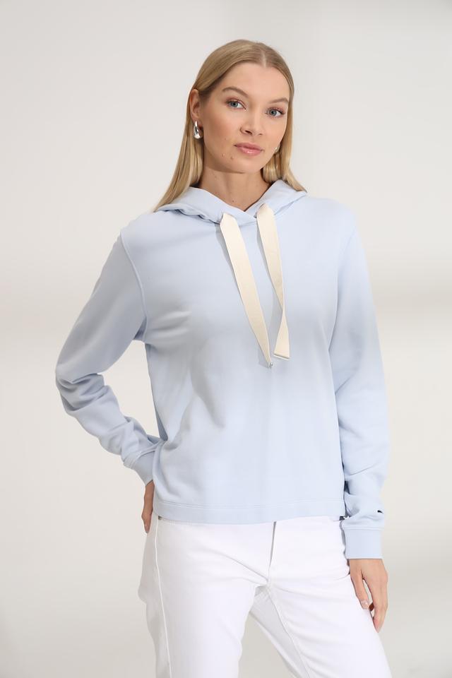 Женский пуловер Marc O Polo голубого цвета с капюшоном и шнурками. Изготовлен из мягкого хлопка, обеспечивающего комфорт и удобство в носке. Стильный и практичный выбор для повседневного гардероба. Состав: хлопок 100%