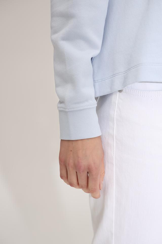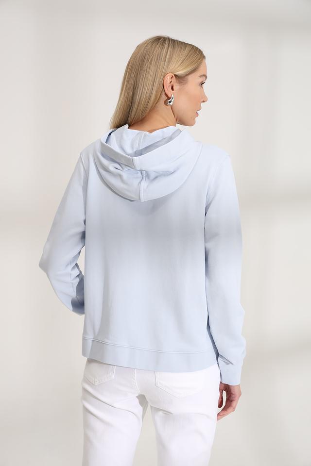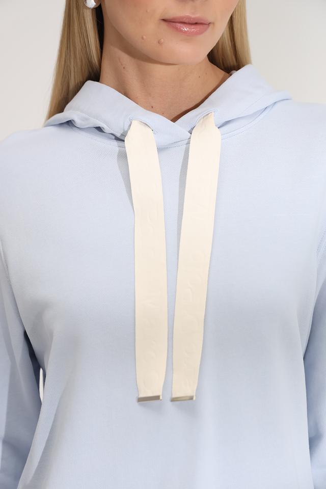 Модель имеет свободный крой, капюшон и шнурки, которые добавляют образу непринужденности и спортивности. Голубой цвет пуловера освежает и легко сочетается с другими элементами гардероба.