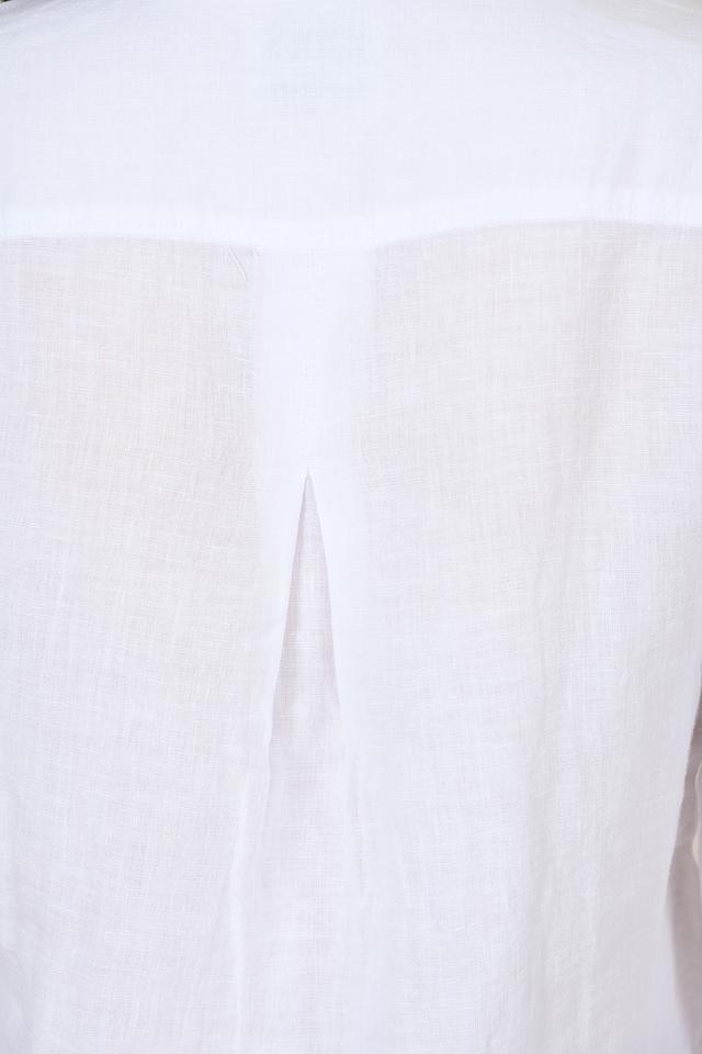 Рубашка имеет классический крой с длинными рукавами и отложным воротником. Застежка на пуговицы по всей длине. На груди расположен накладной карман, добавляющий функциональности и непринужденности образу. Ткань рубашки имеет слегка выраженную текстуру, характерную для натурального льна.