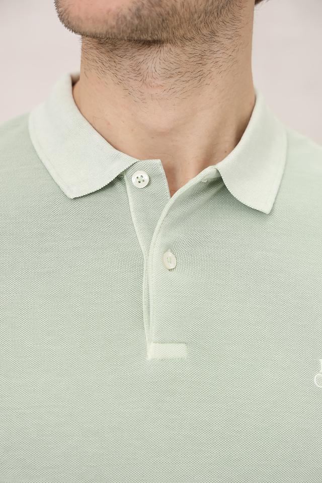 Модель имеет классический крой, короткие рукава и воротник-поло с двухпуговичной застежкой. Цвет поло – нежный мятный, который легко сочетается с различными элементами гардероба. На груди расположена небольшая вышивка с логотипом бренда, добавляющая изделию узнаваемость.
