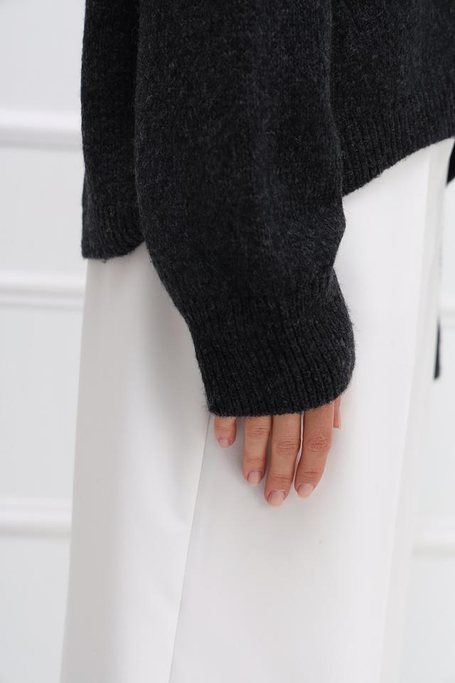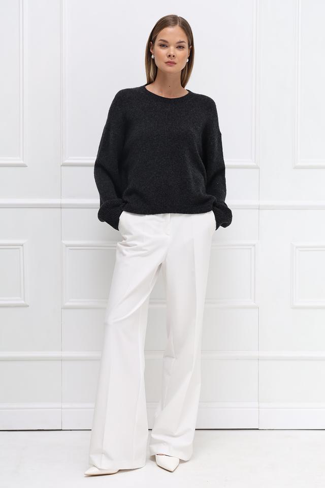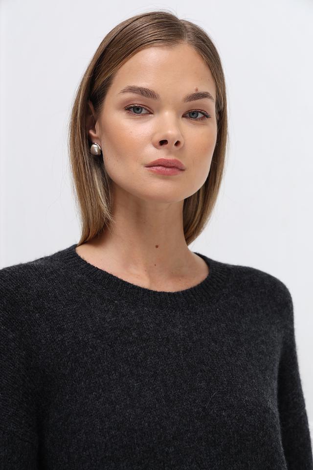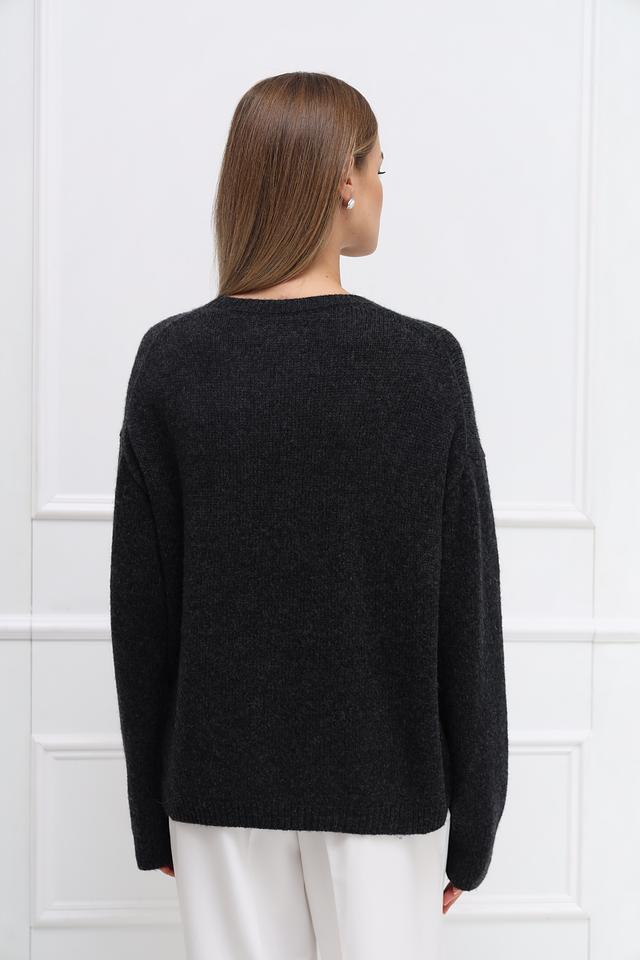 Пуловер имеет свободный крой, который не сковывает движений и обеспечивает максимальный комфорт. Округлый вырез горловины и длинные рукава делают его универсальным для различных погодных условий. Слегка спущенная линия плеч придает образу непринужденность и расслабленность.
