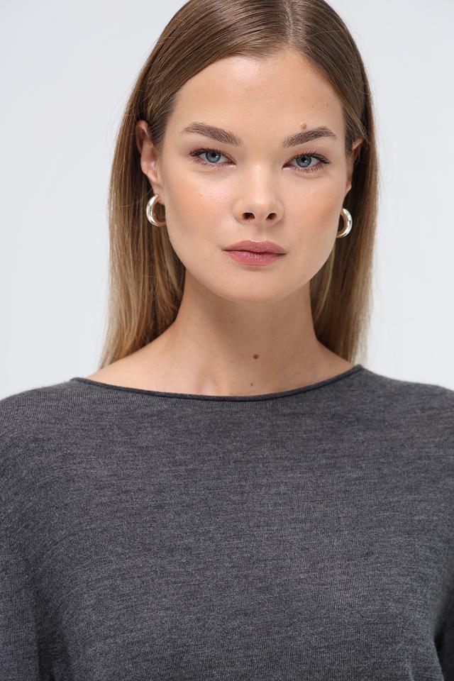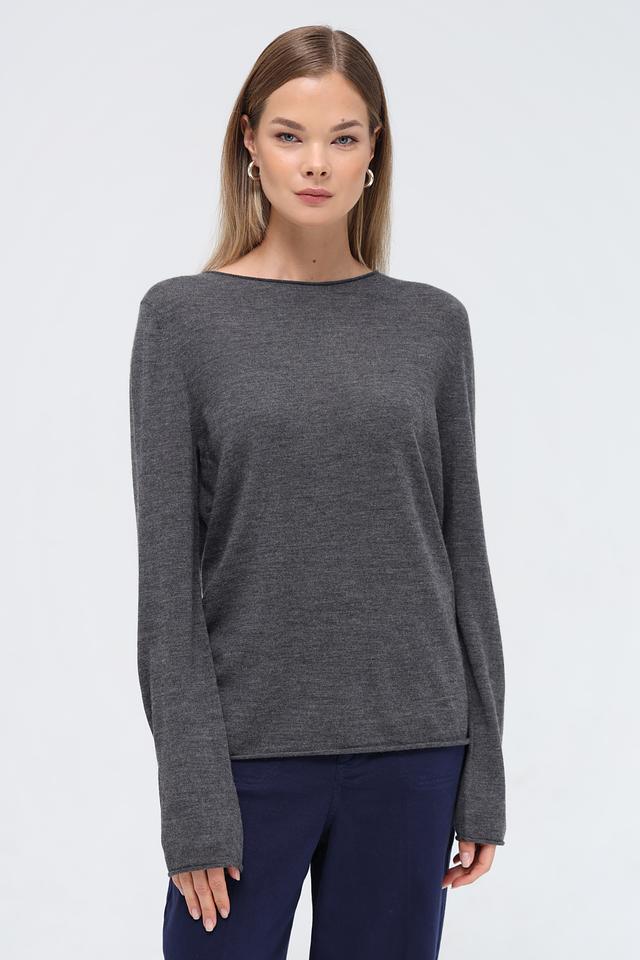 Модель имеет прямой крой, круглый вырез горловины и длинные рукава. Пуловер выполнен в спокойном сером цвете, который легко сочетается с различными элементами гардероба.
