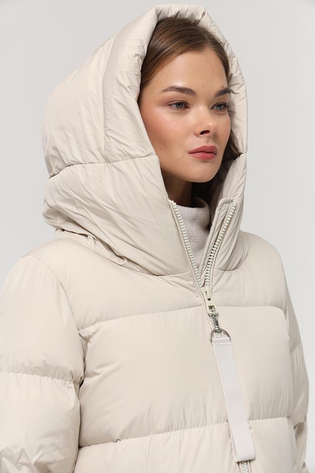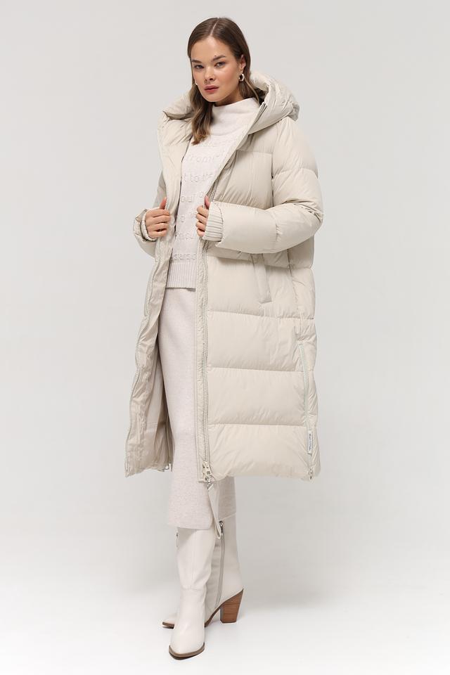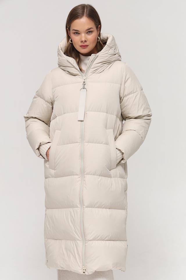 Данная модель выполнена в нежном бежевом цвете и имеет стеганую текстуру, которая придает ей особый шарм. Пальто имеет прямой крой, который обеспечивает свободу движений, а также удобный капюшон, защищающий от непогоды.