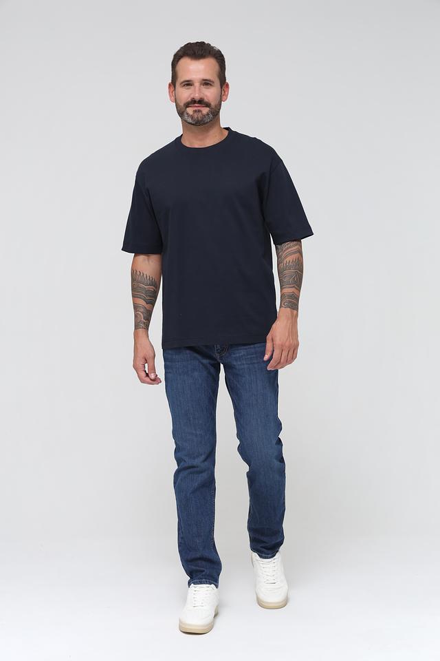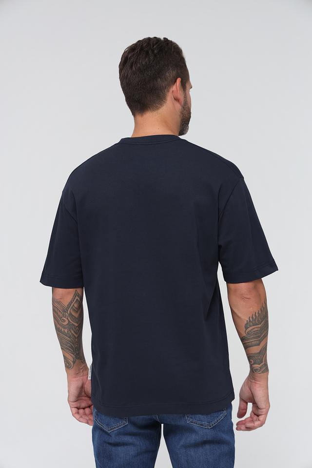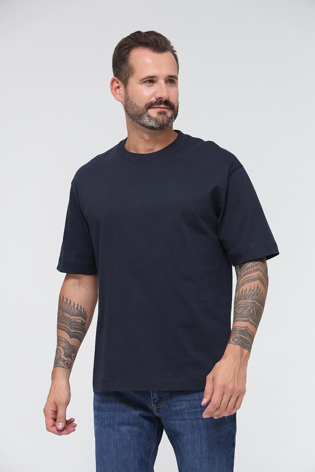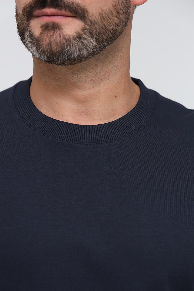 Цвет футболки – насыщенный тёмно-синий, что делает её легко сочетаемой с различными элементами гардероба. Круглый вырез горловины и короткие рукава обеспечивают удобство в носке. Отсутствие каких-либо принтов или логотипов делает эту футболку особенно универсальной.