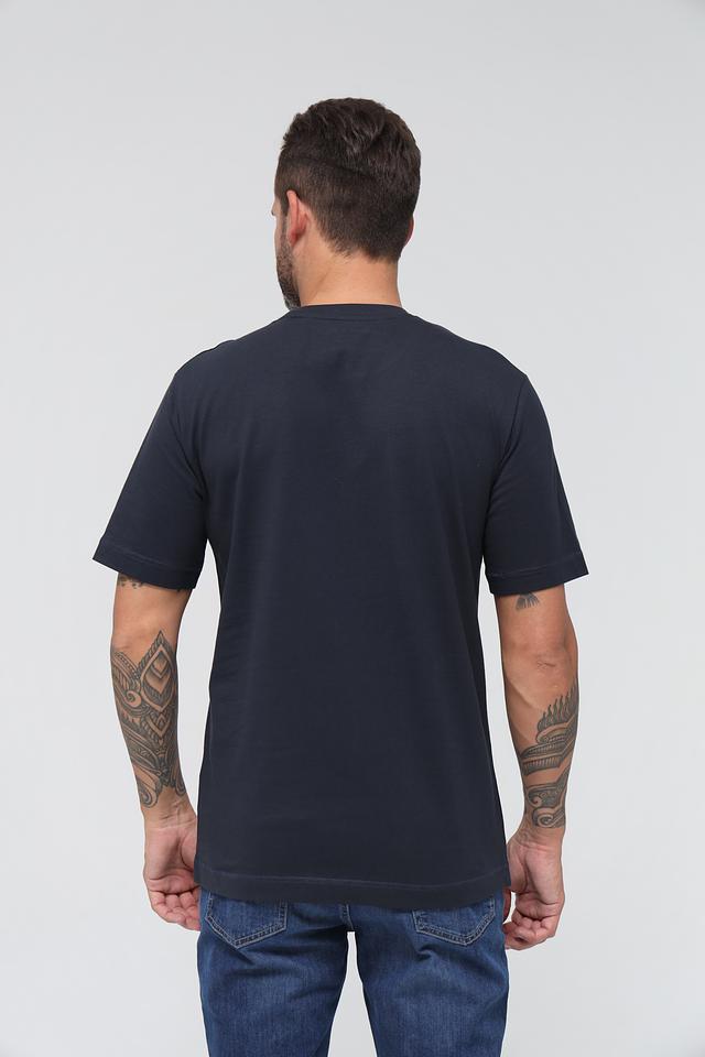 Классический крой и тёмно-синий цвет делают эту футболку универсальной и подходящей для различных образов. Она легко сочетается с джинсами, шортами или брюками, позволяя создавать как повседневные, так и более элегантные комплекты.