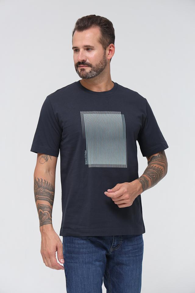 Мужская футболка Marc O Polo тёмно-синего цвета с оригинальным геометрическим принтом. Изготовлена из 100% хлопка, обеспечивающего комфорт и воздухопроницаемость. Стильный и лаконичный дизайн делает эту футболку отличным выбором для повседневного гардероба. Состав: хлопок 100%