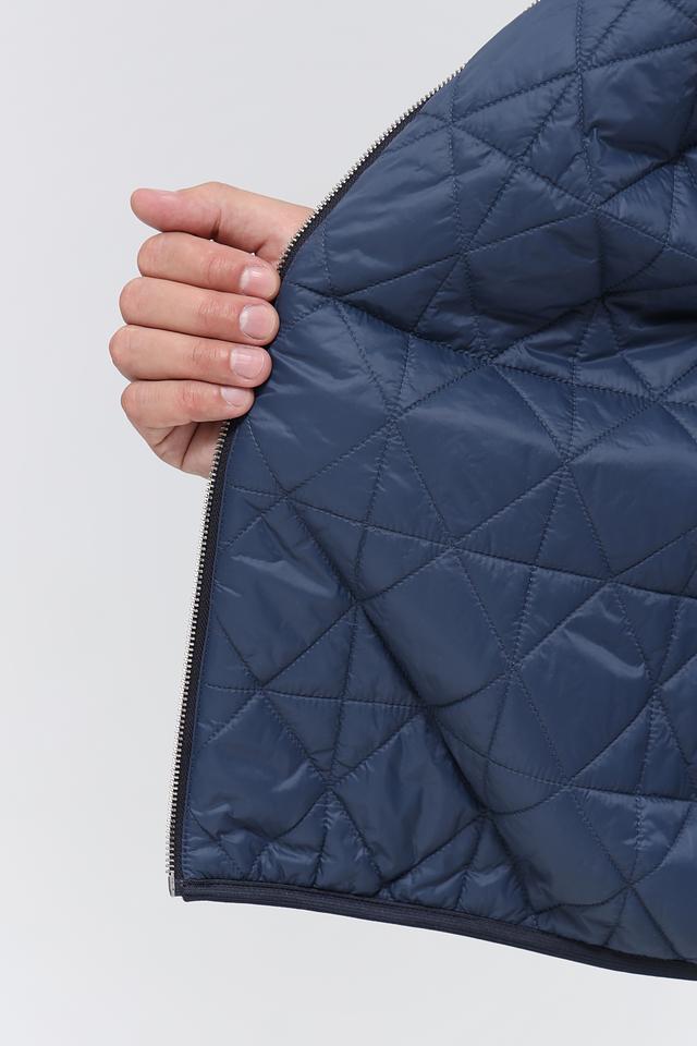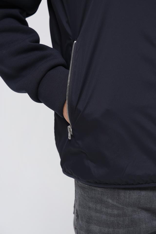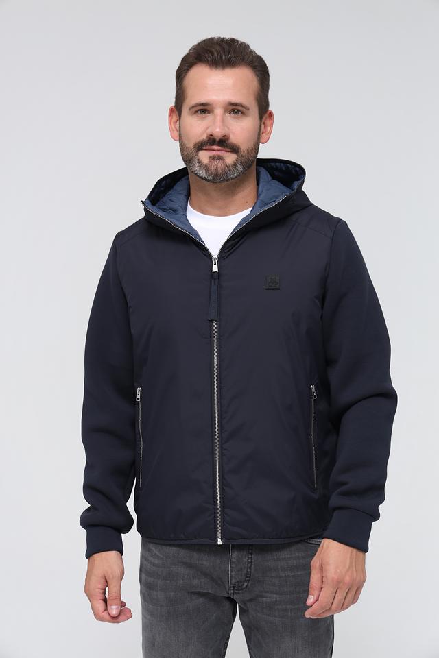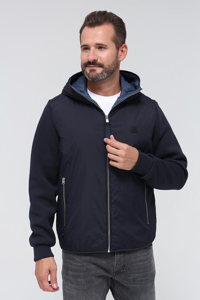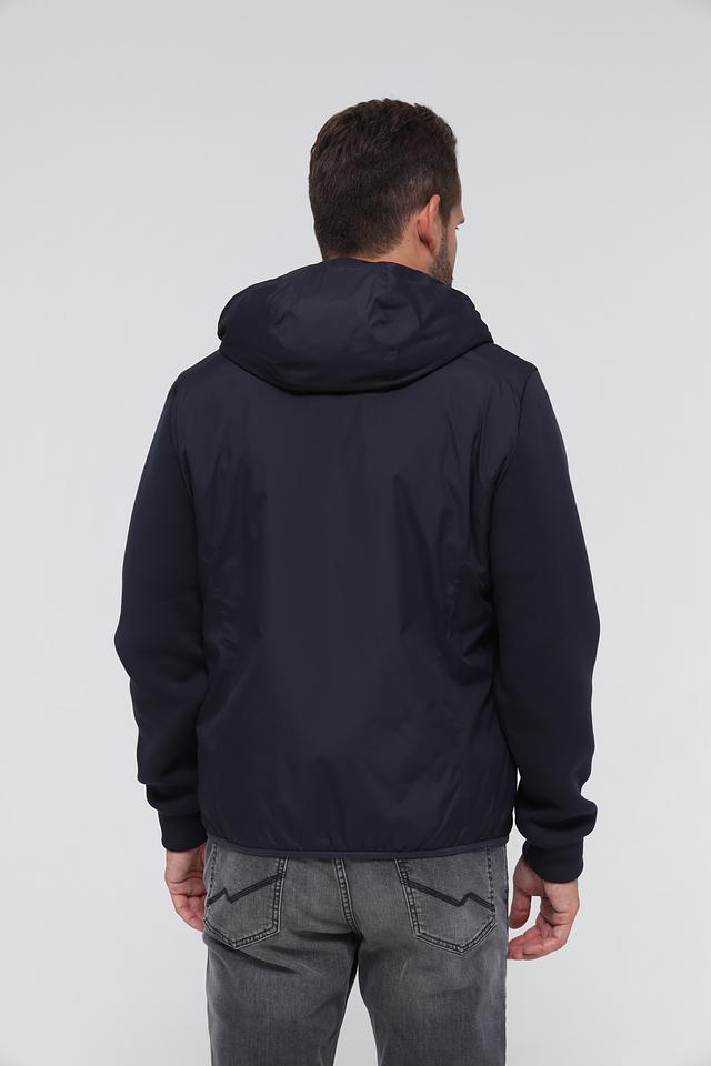 Куртка имеет тёмно-синий цвет, который легко сочетается с различными элементами гардероба. Капюшон добавляет практичности, а манжеты и нижний край куртки выполнены из эластичной ткани, обеспечивая плотное прилегание.