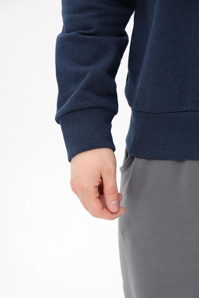 Модель имеет классический крой с капюшоном и карманами. Синий цвет толстовки универсален и легко сочетается с другими элементами гардероба.